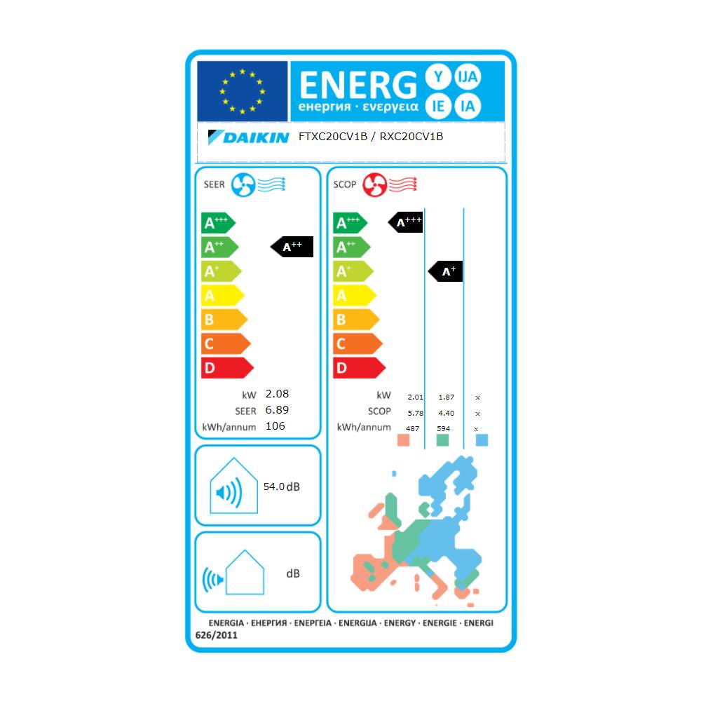 Eficienta energetica oferita de aparatul de aer conditionat Daikin Sensira Bluevolution FTXC20C-RXC20C este foarte buna, avand clasa A++, cu un consum nom/min/max de 595/300/1150 W/h la racire si clasa A+ cu punctul bivalent (incalzire medie Tbiv) la -10°C compensat cu clasa A+++ cu temperatura exterioara de la -10°C la -15°C, cu un consum nom/min/max de 670/280/1350 W/h la incalzire.