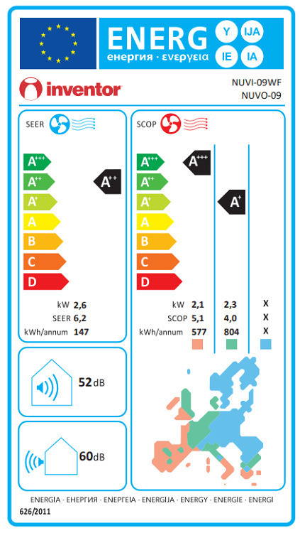 In plus acest model are eficienta energetica in functie de sezon cu coeficient de randament SEER de 6,2 la racire si de (4 pana la limita de -10°C) sau de (5,1 intre -10°C pana la limita de -15°C), coeficient de randament SCOP la incalzire medie. Aceste date reflectă consumul real de energie al pompe de căldură Inventor, cu emisii de CO2 mai scăzute.