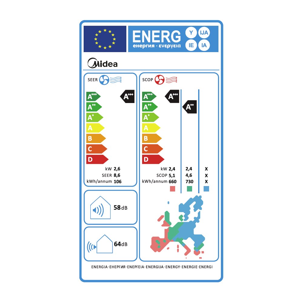 Eficienta energetica oferita de acest sistem de climatizare de la Midea este foarte buna, avand clasa A+++, cu un consum med/min/max de 600/130/1200 W/h la racire si clasa A++ cu punctul bivalent (incalzire medie – Tbiv) la -15°C combinat cu clasa A+++ cu temperatura exterioara de pana la -20°C, cu un consum med/min/max de 690/120/1400 W/h la incalzire.