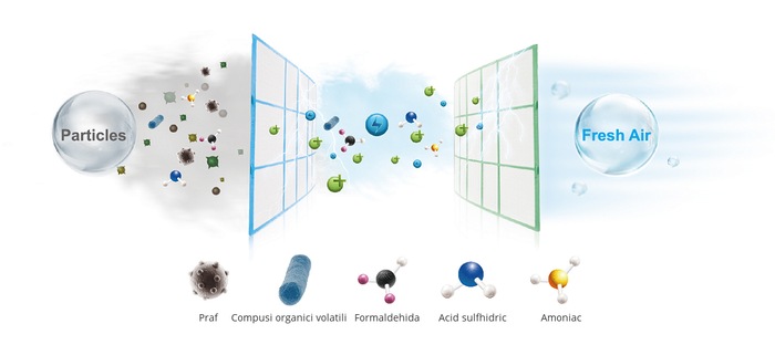 Pentru a oferi un aer mai curat si cu mai multa prospetime aparatul Midea Blanc este dotat cu un model avansat de sistem activ de filtrare in 2 pasi a aerului, avand un flux inalt de aer dar silentios. Pre-filtrul HEPA lavabil este capabil pentru eliminarea din aer a particulelor pana la 0,3 microni. Asa dimensiune mica are polenul, fumul, parul de animal, praful de mucegai si praful care pluteste in aer. Suprafata filtrului este tratata cu Ioni de argint ce inhiba dezvoltarea microorganismelor si bacteriilor pentru a purifica aerul din cameră. Filtrul se curata foarte usor prin spalare cu apa si detergent. In plus are si un filtru Cold Catalyst Filter ce retine formaldehide ca de exemplu compusi organici volatili si celelalte gaze toxice. Este unul din cele mai bune sisteme de filtrare pentru retinerea și neutralizarea substanțelor chimice, gazelor, mirosurilor, substantelor organice volatile si fumului de tigara pe care filtrul HEPA nu le poate detine.