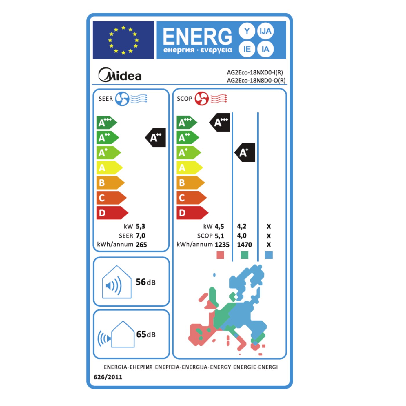 Aparatul de aer conditionat Midea Xtreme ECO UV, AG2Eco-18NXDO-l(R) poate functiona la modul de incalzire si la temperaturi negative mai mari de -15°C dar in schimb cu consumuri energetice mai mari. Calculul consumului anual de energie electrica pentru racire si, respectiv, incalzire se face conform normelor europene la un numar de 350 de ore de functionare la modul de racire si de 1400 de ore de functionare la modul de incalzire pe an (intr-o zona cu conditii climatice medii). Chiar daca temperatura exterioare scade sub -7°C, acest lucru nu influenteaza prea mult consumul compensat de energie deoarece orele de functionare cu temperaturi negative rareori depasesc cateva zile de functionare pe parcursul unui sezon rece.