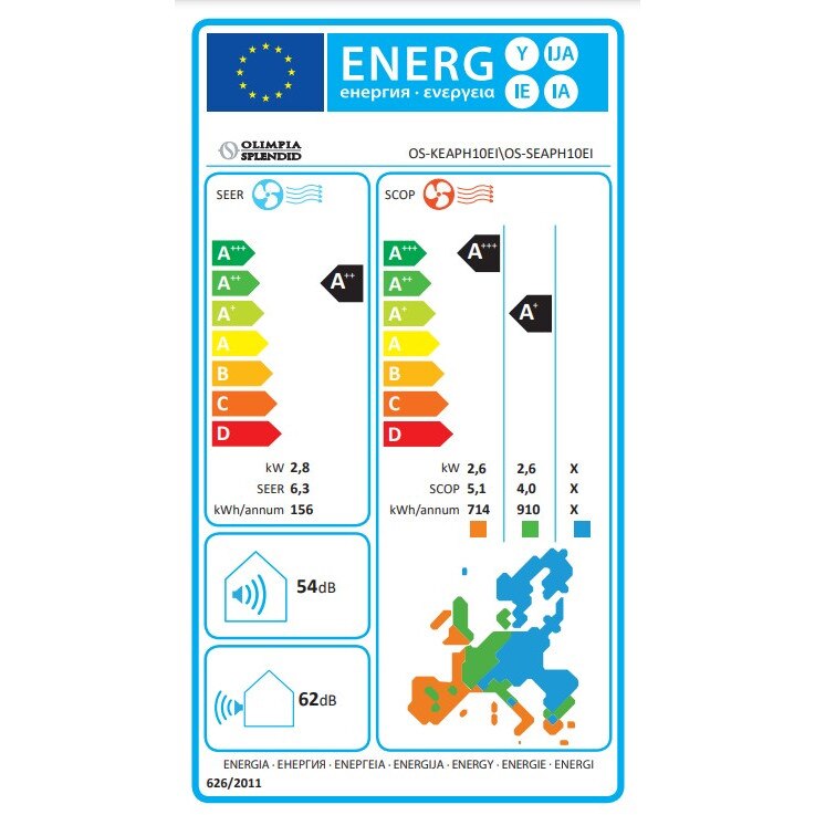 In plus acest aparat de aer conditionat Olimpia Splendid Aryal OS-KEAPH10EI/OS-SEAPH10EI are o eficienta energetica in functie de sezon cu coeficient de randament SEER de 6,3 la racire si de (4 pana la limita de -7°C) sau de (5,1 intre -7°C pana la limita de -15°C), coeficient de randament SCOP la incalzire medie. Aceste date reflectă consumul real de energie al pompe de căldură Aryal, cu emisii de CO2 mai scăzute.
