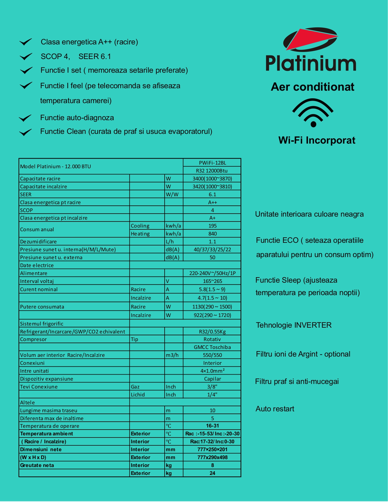 Tehnologia inteligenta a aparatului de climatizare Platinium PF-12DC2 face posibila reducerea consumului de energie electrica de la 4-5 W la 1 W in stand-by, conducand la o economie de energie de 80%. Unitatea interioara cantareste 8 kilograme avand dimensiunile de (L, l, H)mm: 777 x 201 x 250, iar cea exterioara are o greutate de 24 kilograme cu dimensiunile de (L, l, H)mm: 777 x 290 x 498. Agentul frigorific R-410A, care este utilizat in prezent in aparatele de aer conditionat tip split va fi interzis incepand cu 2025, datorita potentialului sau ridicat de incalzire globala (GWP). Pe acest considerent cei de la Platinum folosesc un agent frigorific de ultima generatie R32. Agentul frigorific R32 este un freon sintetic, care nu contine clor in molecula (CH2F2, difluormetan). Acest tip de freon apartinand clasei hidroflurocarburi (HFC) nu afecteaza mediul si este printre principalele fluide frigorifice pentru viitor. In plus R32 este un agent frigorific de generatie viitoare, care transporta in mod eficient caldura si are un impact redus asupra mediului. Un avantaj al utilizarii freonului R32 este eficienta mai mare decat cel al agentului frigorific R410A. Acest tip de freon trebuie sa fie utilizat numai in sistemele proiectate special pentru R32.