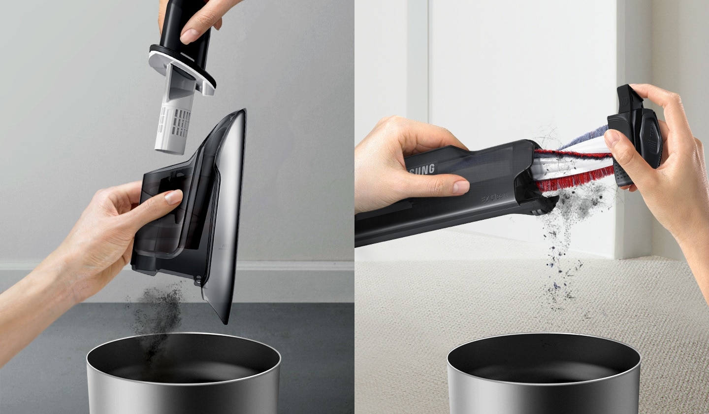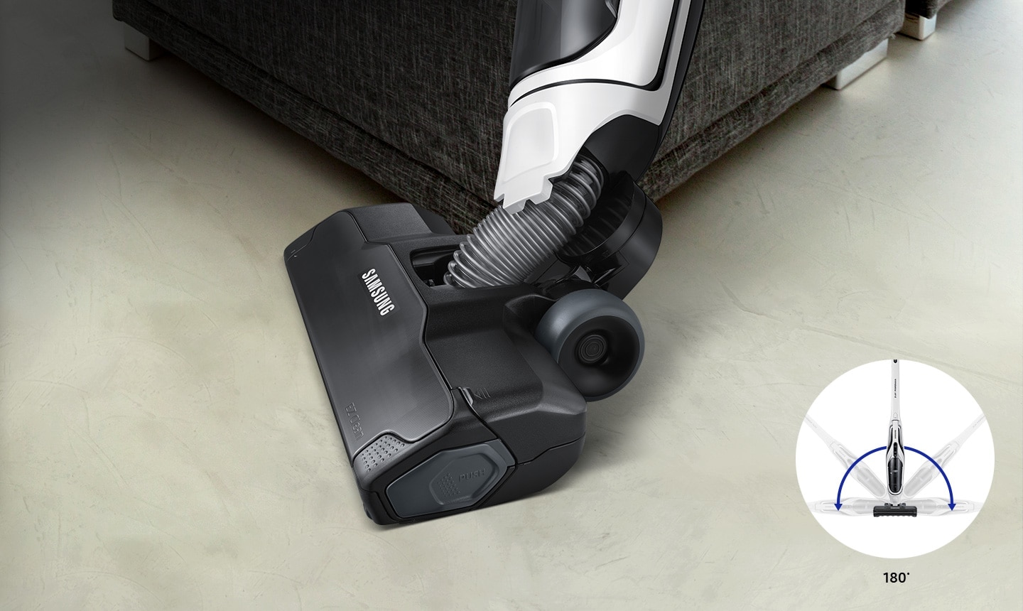 Aspiratorul vertical are un design placut la vedere fiind construit dintr-un material mat din plastic de buna calitate de culoare alb/negru. Functionalitate 2-in-1 Stick-Handheld a acestui model ne ofera un aspirator cu tija si un aspirator portabil de mana la un loc, pentru a curata usor atat podeaua si mobila. Cu un aspirator fara sac, putem sa nu mai cautam tipul potrivit de saci în magazine sau online, evitand totodata sa cheltuim bani pe acestia. În fond, aspiratorul ar trebui sa curete numai podelele, nu si portofelul. Acest model 2019 cu certificate de autorizare CE si Eurasianne ofera cele mai bune rezultate de curatare pe suprafetele dure si covoare. Tehnologia Cyclone Forze de la Samsung ofera cele mai bune rezultate de curatare dintr-o singura miscare prin intermediul unor pasi extrem de eficienti: 1) Aerul intra rapid in dispozitivul Cyclone Forze datorita fantei de admisie aer drepte si netede. 2) Orificiul curbat de trecere a aerului, accelereaza aerul in compartimentul ciclonic pentru a separa praful de aer, datorita fortei de centrifugare. Iar capul de aspirare cu peria Ez Clean Brush dotata cu tehnologia Ez Clean ce iti permite sa indepartezi cu usurinta si intr-un mod igienic praful, parul sau reziduurile din recipientul de colectare.