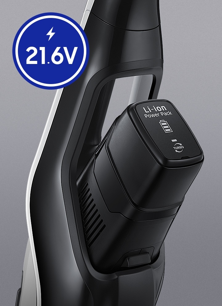 Acest acumulator ce se poate detasa usor, se caracterizeaza prin timpi de functionare extra-lungi si timpi de incarcare scurti. In acest sens, timpul de functionare al acestui model fiind de 40 pana la maxim 60 de minute. Bateriile Li-Ion sunt concepute pentru a proteja mediul si cu o performanta ridicata, sunt si foarte usoare, oferindu-ne o experienta de curatare mai durabila. Bateriile acestui model sunt reincarcabile pe o durata de 4 ore, cu ajutorul unei statii de incarcare, pentru o functionare fara fir si ofera libertatea de a curata oriunde vrem. Acum cablul de alimentare nu mai constitue o bariera si putem curata usor in diferite camere ale locuintei fara efort special.
