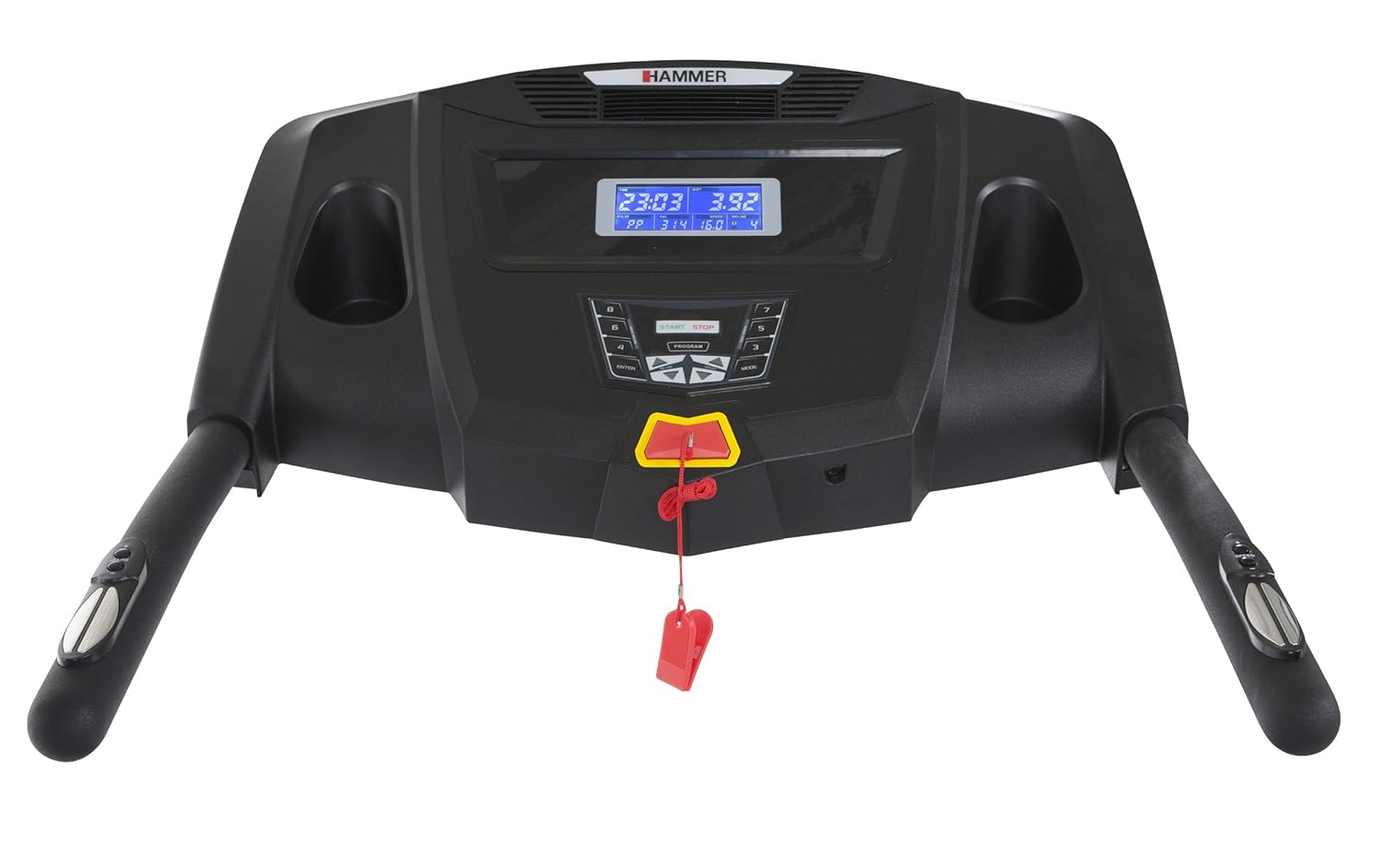 Acest model este dotat tehnic pe bara de rezistenta a cadrului cu un aparat cu display avand butoane senzitive, cu ecran LCD clar Blue Backlight, cu un numar mare de 18 programe de antrenament (P1-P18) presetate dintre care 4 programe de antrenament sunt controlate de ritmul cardiac, care afiseaza: viteza de deplasare a covorului, distanta, timpul de antrenament, calcularea caloriilor medii consumate, unghiul de inclinare si puls. Pe baza datelor obtinute, acest aparat poate masura, de asemenea, grosimea stratului adipos. Astfel ca succesul exercitiului de formare este vizibil pentru a mentine la cote inalte motivatia. Putem sa selectam unul dintre cele patru programe de ritm cardiac, ce corespund unui ritm cardiac de 55%, 75% sau de 90% din ritmul cardiac maxim, sau pentru a seta la o valoare individuala de antrenament. Banda de alergare Hammer Light Runner LR16i va derula programul de antrenament in mod automat, fara a mai fi nevoie sa apasati pe butoane suplimentar, pentru a modifica viteza de deplasare si unghiul de inclinare, pana cand ritmul cardiac maxim stabilit a fost atins. Dupa ce ati depasit frecventa cardiaca maxima, sistemul inteligent al aparatului va reduce viteza si unghiul de inclinare pana cand veti reveniti la nivelul optim al pulsului cardiac. Banda are si 2 suporturi pentru sticla de apa sau alte obiecte.