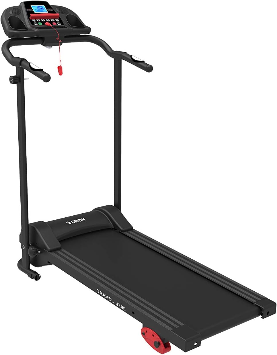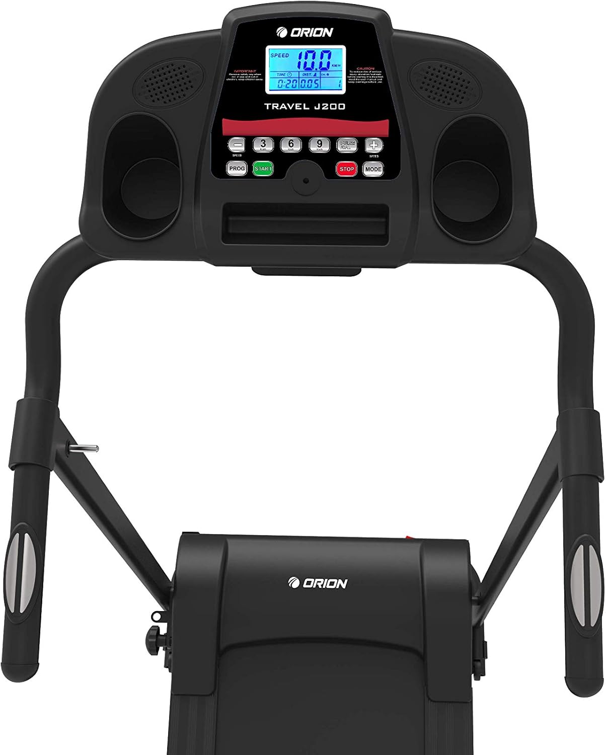 Banda de alergat electrica Orion TRAVEl J200 de culoare negru, cu dimensiunile pliabile de: (L, l, H)cm 61 x 62 x 130 este usoara cu o greutate neta de numai 24,5 kg, ocupa putin spatiu, putand sa fie foarte usor depozitata in debara. Sistemul de pliere manual este dotat si cu un dispozitiv de blocare la pliere. Depliere acestui model dupa deblocare se face la fel manual.