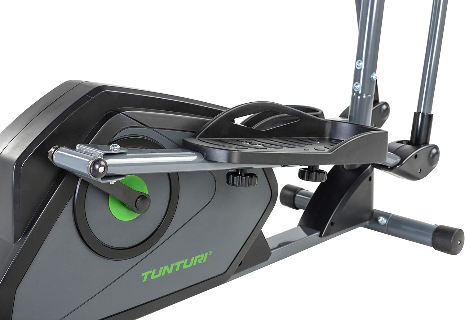 Bicicleta eliptica Tunturii Cardio Fit C30 de culoare gri/negru este un aparat de fitness casnic, care imbina avantajele mersului si alergatului cu cele ale ciclismului, ce va permite o miscare uniforma punand astfel in miscare toate grupele de muschi importante atat la nivelul abdomenului, picioarelor feselor, umerilor si coloanei. Acest model cu dimensiunile dupa ansamblare de: (L, l, H)cm 124 x 60 x 163 are o greutate neta de numai 29,9 Kg si nu ocupa mult loc. Dimensiunea ambalajului este de: (L, l, H)cm 104 x 33 x 48. Ca modalitate de protectie la accidente, pedalele anti-slip sunt prevazute cu un sistem antiderapant care fac ca piciorul sa ramana fix pe toata perioada exercitiului. Lungimea suportului de sprijin pentru talpa piciorului este incapator cu lungimea pasului de 33 cm. Distanta dintre pedale este de 20 cm. Inclinatia pedalei este ajustabila dupa preferinte. Iar pentru un plus de confort pedalele pot fi montate pe doua pozitii.