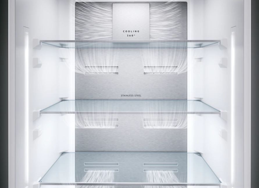AEG RCB736E5MX cu un singur compresor si 2 circuite de racire este un aparat frigorific practic dotat cu tehnologii de varf fiind perfect pentru o familie numeroasa, cu diverse preferințe culinare. Tehnologia Twin Tech Frost Free de la AEG cu Intelligent Free Store distribuie aerul rece uniform si garanteaza un nivel optim de umiditate in frigider. Alimentele isi pastreaza gustul si textura pentru mai mult timp datorita sistemelor independente de racire cu umiditatea controlata a aerului din frigider si uscata din congelatorul fara gheata. In plus aparatul are debit multiplu ce functioneaza la toate nivelele, prin intermediul unor mici orificii de ventilare de pe fiecare raft si pastreaza o temperatura uniforma in tot frigiderul. Acest sistem avansat de racire la 360° distribuie aerul rece peste tot in spatiul de refrigerare si datorita panoului din otel inoxidabil din spate, care datorita inertiei termice mai mari, provoaca o revenire rapida la temperatura setata dupa deschiderea usii. Astfel prin racirea simultana multipla a tuturor sectiunilor si ale tuturor compartimentelor, alimentele pot ramane proaspete mai mult timp. In plus, cu acest sistem de racire se elimina transferul mirosurilor si se opreste deshidratarea produselor depozitate, nu exista posibilitatea ca aerul sa circule intre compartimentul de refrigerare si cel de congelare.