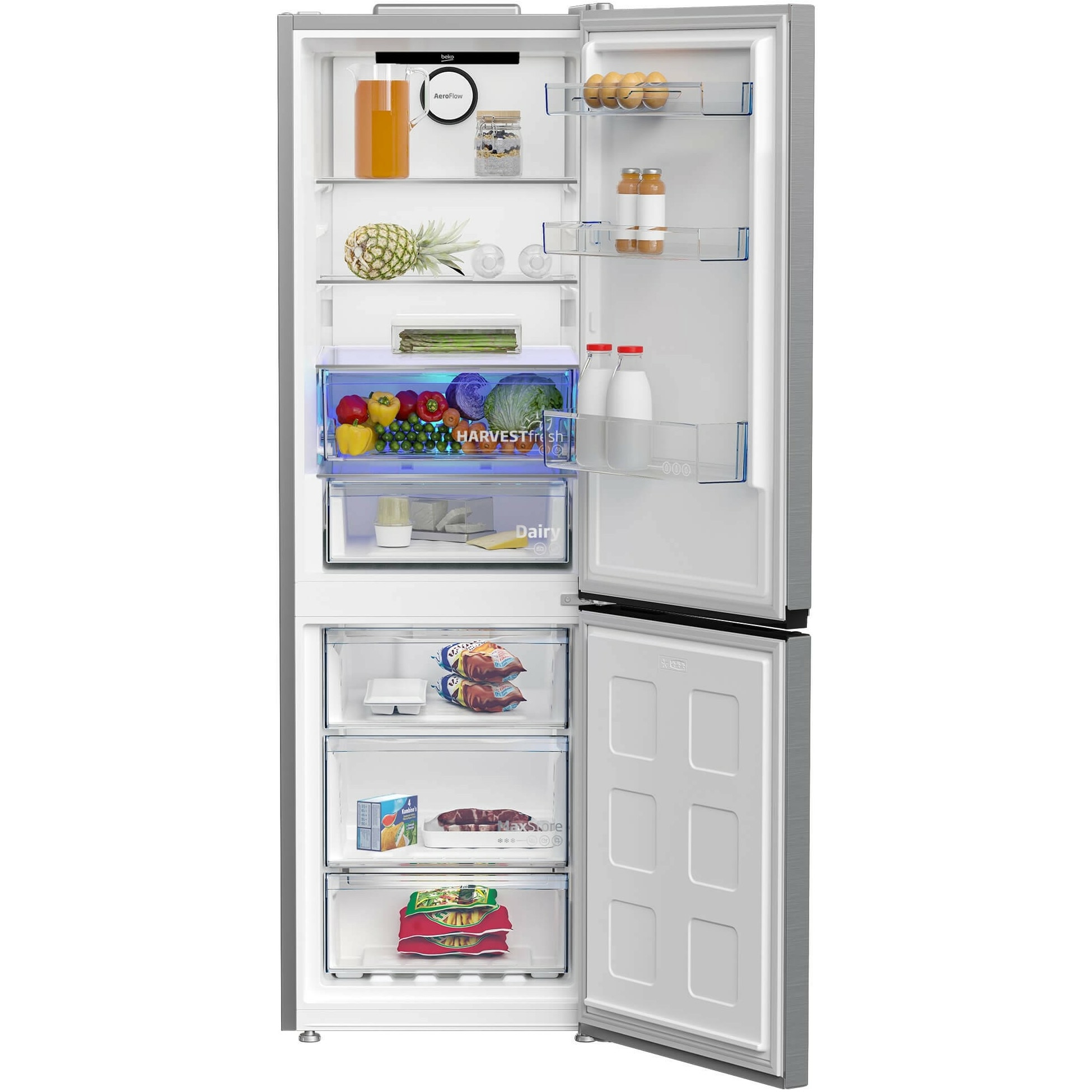 In partea inferioara a frigiderului se afla compartimentul Ever Fresh+, etans, de depozitare al legumelor si fructelor cu capacitatea de 30 de litri, ce le pastreaza un timp indelungat proaspete si cu aromele nealterate ca in ziua in care au fost culese. In aceasta zona temperatura este pastrata in limita de 5°C iar nivelul umiditatii la interior este realizat, prin design-ul constructiv al sertarului si prin intermediul curentilor de aer, fapt ce reduce considerabil efectul de ofilire a verdeturilor si legumelor si prelungeste durata de conservare, de pana la 3 ori mai mult fata de frigiderele obisnuite. In plus acest spatiu de racire este dotat si cu tehnologia Harvest Fresh, inspirata din propietatile lumini solare, unde un mix format din 3 culori, simuleaza lumina naturala in acest spatiu, pentru a pastra vitaminele din fructe si legume pentru o perioada mai lunga de timp. Aceasta tehnologie mareste durata de pastrare a morcovului a telinii a rosiilor, etc. in conditii optime conform testari Intertek de pana la 5 zile. Sub acest spatiu de racire in zona cea mai rece a zonei de refrigerare se afla compartimentul Dairy cu capacitatea de 30 de litri si temperatura de -2°C ideal pentru depozitarea carnii, pestelui si fructelor de mare. Temperatura este cu cateva grade mai scazuta decat in restul frigiderului, extinzand considerabil prospetimea. Acest compartiment mai poate fi folosit si pentru decongelare produselor din congelator ce pot fi procesate in cel mai scurt timp. Usa frigiderului reversibila cu maner integrat orizontal si deschidere spre dreapta este echipata cu 3 suporturi fixe pentru o compartimentare specializata ca de exemplu: In primul suport specializat pentru depozitarea de condimente si oua, iar urmatoarele doua suporturi specializat pentru depozitare de borcane si recipiente din sticla cu inaltime peste medie. Usa acestei combinei se deschide la un unghi de 90° ce permite o functionalitate maxima si pentru spatiile mai putin generoase. Cu acest sistem de deschidere acest model independent se poate incorpora si in mobila de bucatarie. Aparatul frigorific este dotat si pe partea de frigider si congelator cu rafturi cu glisare usoara construite pe balamale glisante ce pot fi scoase cu usurinta in afara spatiului de racire. Acest lucru permite accesul cu usurinta la alimente, vazand imediat ce este depozitat in spatele raftului. Beko B3RCNA364HXB1 cu sistemul de iluminare LED Light sus in zona de refrigerare, ofera o lumina mai puternica, cu mai putina caldura degajata si consum energetic de 7 ori mai mic.
