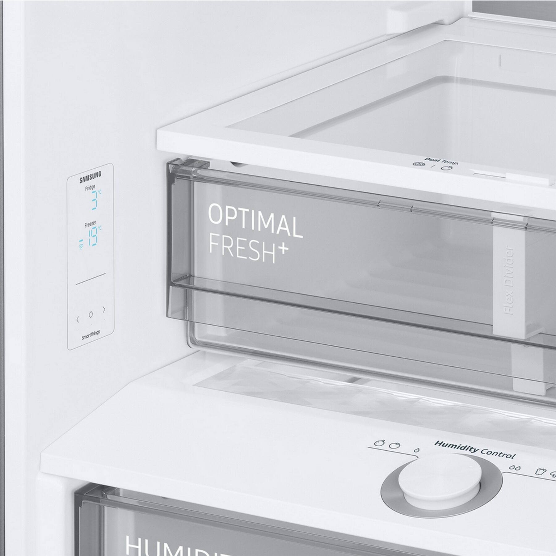 Pentru un plus de confort acest aparat frigorific de la Samsung este dotat cu tehnologia versatila Be Spoke ce iti da posibilitatea de a combina unul sau mai multe aparate frigorifice de acelasi tip, dintr-o gama de 23 de culori, in functie de marirea familiei, prin cresterea numarului de copii si de spatiul disponibil. Astfel folosind aceasta oportunitate ai posibilitatea de a personaliza si combina aparatura frigorifica, pentru a se potrivi stilului tau de viata. Samsung Be Spoke iti permite sa alegi diferite tipuri de produse, culori si finisaje care sa corespunda gusturilor si nevoilor tale unice. La inceput poti sa incepi cu un singur aparat frigorific urmand sa adaugati un nou madel Be Spoke, fiind mai util decat sa-l inlocuiesti pe cel pe care il detii deja, extinzand si durata de functionare a aparatului frigorific existent. Astfel mai intai selectezi stilul spatiului unde plasezi aparatura frigorifica, urmand sa alegi propria combinatie de frigider congelator. Panoul de comanda cu afisaj LCD de dimensiuni generoase impreuna cu controlul electronic premium de tip touch control pozitiona in interiorul aparatului pe peretele din dreapta, monitorizeaza 2 zone de temperatură de racire ce pot fi reglate independent, inlocuind clasicele butoane care devin din ce in ce mai demodate. Pentru a activa afisajul este nevoie sa atingeti ori si ce buton de pe panoul de comanda. Cu ajutorul butonului senzitiv notat cu semnul grafic O prin apasari succesive aveti posibilitatea de a selecta functia de racire in zona de refrigerare sau in zona de congelare. Iar in continuare cu ajutorul a doua butoare cu sageti prin apasari succesive puteti selecta temperatura ori functia dorita pentru spatiul de racire ales. Elementele de comanda ale aparatului contin: Afisare temperatura in congelator; Afisare temperatura in frigider; Functia de Super Congelare; Functia de Super Racire; Functie Vacanta; Functia Cool Select Plus; Functia Al Energy; Functia Wi-Fi; Indicator avertizare pentru sectiune congelator; Indicator avertizare pentru usa deschisa. Indicatoarele de pe panoul de comanda adresate zonei de refrigerare sunt urmatoare: Afiseaza temperatura curenta sau temperatura selectata; Indicator de activare a functiei de Super racire; Indicator de activare a functiei de Vacanta. Indicatoarele de pe panoul de comanda adresate zonei de congelare sunt urmatoare: Afiseaza temperatura curenta sau temperatura selectata; Indicator de activare a functiei de Super congelare. Indicatoriul vizual si sonor de usa deschisa se activeaza daca usa este deschisa mai mult de 2 minute. Frigiderul ofera un interval cuprins intre 1°C si 7°C, cu (valoarea prestabilita de 3°C), in timp ce temperatura din congelator poate varia intre -15°C si -23°C. Pentru un plus de confort cu ajutorul butonul senzitiv de control inteligent puteţi controla aparatul frigorific si de la distanta, folosind aplicatia Smart Things Home Care sau Smart Things Cooking, cu ajutorul unui telefon inteligent sau cu o tableta Android sau iOS. Astfel cu aplicatia din dotare Smart Things, recomanda modul de coacere pentru preparatele preferate, iar pentru un plus de confort va sugereaza si 180.000 de retete delicioase prin crearea unui plan de servit masa saptamanal. De asemenea, ofera si o experienta de gatit ghidata cu ajutorul aplicatiei Recipe to Oven, care pot fi transmise la cuptorul compatibil cu aplicatia Smart Things Cooking de la Samsung, pentru rezultate perfecte de gatit. Planificarea meselor si lista de cumparaturi pentru aprovizionarea on line se face cu ajutorul aplicatiei Smart Things Cooking. In acest scop este nevoie doar sa adaugati ingredientele necesare de care aveti nevoie in lista de cumparaturi, apoi cu ajutorul aplicatiei faceti comanda on line in cosul de cumparaturi de la supermarketului dvs. prefera, sau daca accesati magazinul on line puteti sa faceti comanda si direct cu ajutorul telefonului dv. Iar cu ajutorul aplicatiei Smart Things Home Care va anunta automat in timp real o problema, daca un component al aparatului frigorific trebuie sa fie inlocuit, sau va sugereaza o solutie tehnica acesibila. Pentru a utiliza aceasta functie trebuie sa descarcati aplicatia necesara cu denumirea Home Whiz din lista de aplicatii ale dispozitivului dv. inteligent. Puteti utiliza App Store pentru dispozitivele mobile iPhone, iPad si Google Play Store pentru dispozitivele mobile care folosesc sistemul de operare Android OS 8.0 (Oreo TM). Pentru o functionalitate maxima aparatul a fost proiectat ca in partea de sus sa fie plasat frigiderul iar in partea de jos sa fie plasat congelatorul. S-a demonstrat ca frigiderul este mai des folosit decat congelatorul. Acest model are tehnologia de racire automata atat a frigiderului si No Frost fara gheata a congelatorului.