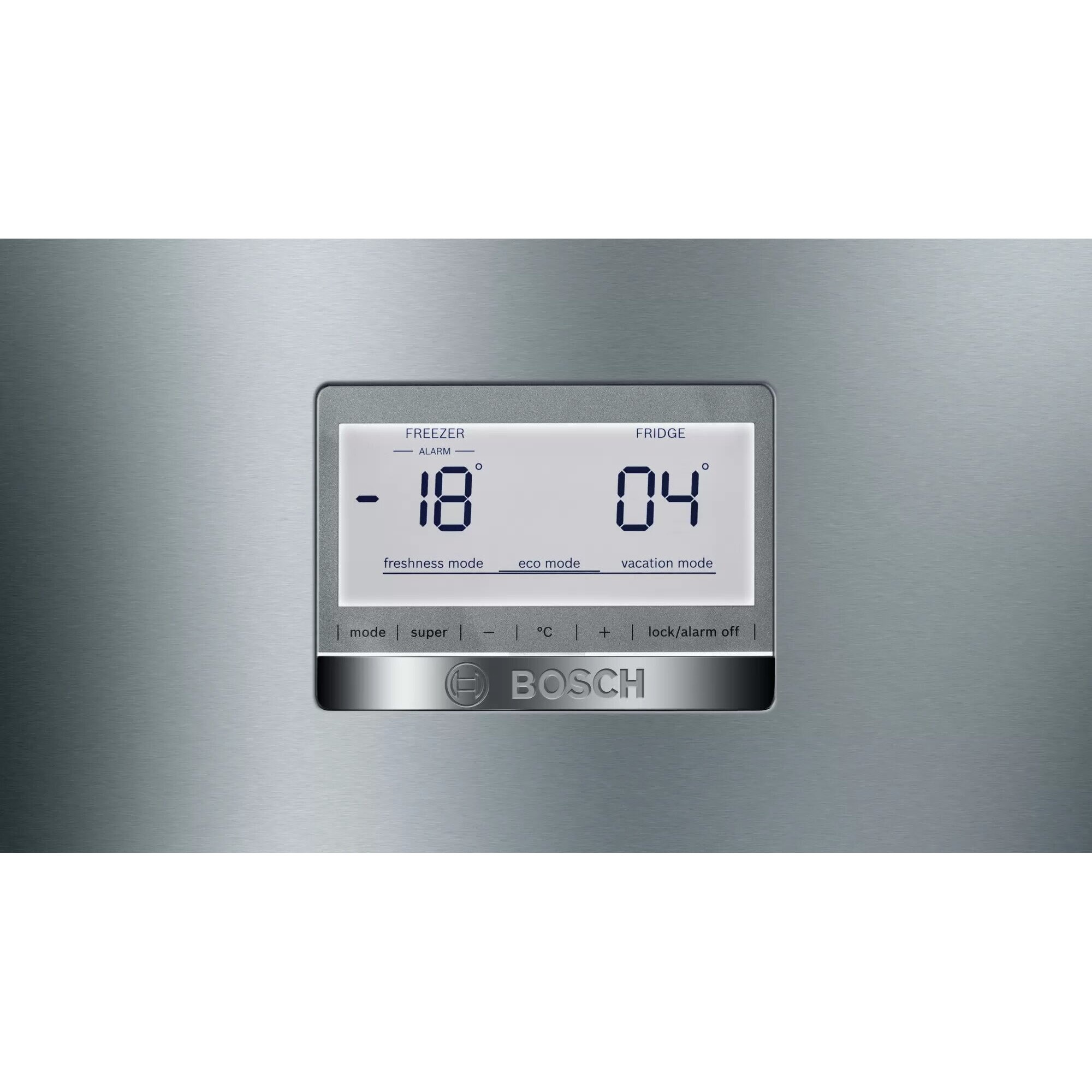 Panoul de comanda cu display LCD postat in exterior pe usa frigiderului, cu controlul electronic, monitorizeaza 2 zone de temperatura ce pot fi reglate independent. Astfel elementele de comanda ale aparatului contin: Reglare si semnalizare temperatura in congelator; Reglare si semnalizare temperatura in frigider; Functie de Super-congelare; Functie de Super-racire; Indicator avertizare pentru sectiune congelator; Sistem de avertizare pentru usa deschisa. Elementele de comanda contin: Tasta de selectare a compartimentului de racire; Tasta de selectare a compartimentului de congelare; Tasta de reglare a temperaturi cu (+) si (-); O tasta cu functia de Super Congelare; O tasta de Super Racire; Tasta de alarma, pentru activarea sau dezactivarea functiei. Pe ecranul LCD se va afisa si temperatura din zona de refrigerare si de congelare. Temperatura in zona de refrigerare se regleaza de la +2°C pana la +6°C iar in zona de congelare de la minim -18°C la -24°C. Din fabrica sunt recomandate ca in zona de refrigerare temperatura sa fie de +4°C, iar in zona de congelate de -18°C. Cu butonul insemnat cu semnul grafic de alarma activam sau dezactivam functia de alarma sonora. Cu butonul ECO activam sau dezactiva functionarea aparatului frigorific cu consum energetic redus. Cu butonul Holiday activam sau dezactivam functia de vacanta. Cu butonul Fresh activam sau dezactivam functionarea spatiului de prospetime. Cu butonul Super congelare printr-o apasare mai lunga de 5 secunde activam sau dezactivam functia de racire intensiva la modul automat in spatiul de congelare. Iar la modul de functioare manual functia de racire intensiva din spatiul de congelare se activeaza prin intermediul aceluiasi buton printr-o apasare scurta. La acest mod de racire congelatorul raceste la capacitate maxima, iar dezactivarea functiei de Super congelare se face manual. Iar cu butonul de Super racire activam functia de racire intensiva in spatiul de refrigerare. La acest model se memoreaza ultima temperatura reglata, iar temperatura care a fost reglata este afisata pe indicatorul de temperatura de pe display. In plus panoul de comanda prezinta si o bara luminoasa ce ofera un feedback vizual asupra reglarilor efectuate. Pentru un plus de confort acest aparat frigorific este dotat si cu aplicatia Dongle ce este un accesoriu optional la Home Connect KSZ10HC00, WLAN/WiFi folosit pentru conectarea aparatelor electrocasnice din casa dotate cu aplicatia Wi-Fi Ready, de monitorizare si control prin intermediul aplicatiei Home Connect.