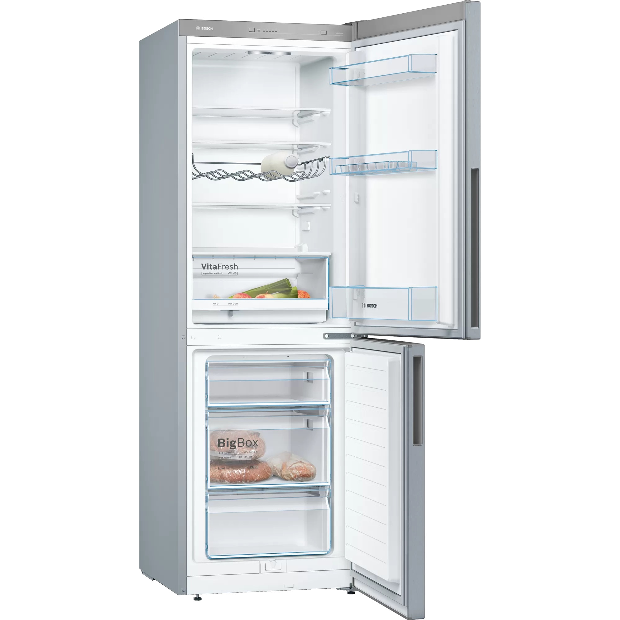 Combina frigorifica Bosch KGV33VLEA cu control electronic este alegerea perfecta daca iti doresti o combina frigorifica dotata cu cele mai noi tehnologii la un pret foarte bun. Design-ul acestei combine frigorifice germane ce face parte din seria 4, este unul foarte atragator ce iese in evidenta prin culoarea argintie a celor doua usi ce imita o suprafata din otel inox si a lateralelor emailate de aceeasi culoare, potrivindu-se perfect in orice colt al casei tale. Pentru o functionalitate maxima aparatul frigorific a fost proiectat ca in partea de sus sa fie plasat frigiderul iar in partea de jos sa fie plasat congelatorul. S-a demonstrat ca frigiderul este mai des folosit decat congelatorul.