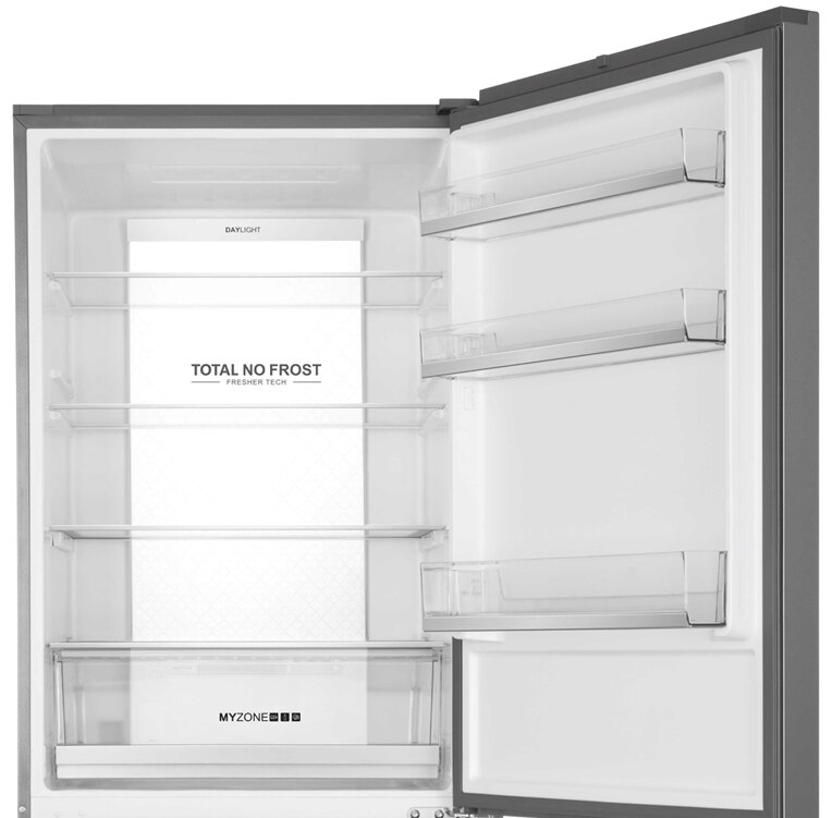 In partea inferioara a frigiderului se afla un spatiu My Zone de 21 de litri de prospetime, etans de asemenea dedicat depozitarii alimentelor proaspete, cu trei niveluri independente de control al temperaturii (Fruit&Vegetale; Super Cool; 0°C; Cool) de +5°C, +2°C la 0°C, de pe panoul de comanda. La accesarea butonului de pe panoul de comanda facem selectia temperaturilor pozitive pentru: fructe, legume, de racire rapida de bauturi la +2°C, sau de pastrare a prospetimii urmat si de congelare usoara. Acest spatiu de prospetime mai poate fi folosit si pentru a decongela alimentele scoase din congelator pentru a fi procesate imediat.