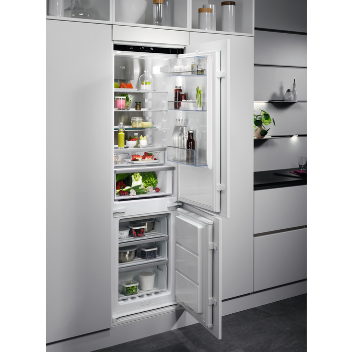 Combina frigorifica incorporabila AEG SCE818E8MS cu un singur compresor si 2 circuite de racire este un aparat frigorific practic dotat cu tehnologii de varf fiind perfect pentru o familie numeroasa, cu diverse preferințe culinare. Tehnologia Twin Tech Frost Free de la AEG cu Intelligent Free Store distribuie aerul rece uniform si garanteaza un nivel optim de umiditate in frigider de 65-90%. Alimentele isi pastreaza gustul si textura pentru mai mult timp datorita sistemelor independente de racire cu umiditatea controlata a aerului din frigider si uscata din congelatorul fara gheata, cu un nivel optim de umiditate in congelator de 25-40%. Acest model cu tehnologie de racire dinamica No Frost pe partea de refrigerare si de congelare are un volum net generos pe frigider de 186 l precum și un compartiment special pentru fructe si legume.