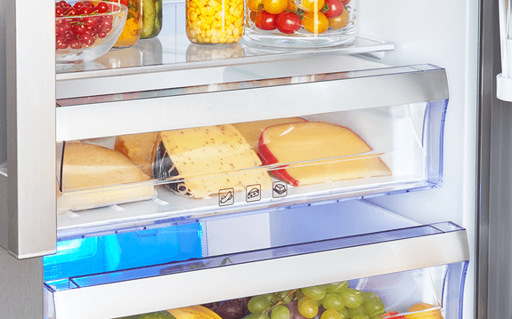 In partea inferioara a frigiderului se afla compartimentul Ever Fresh, etans, de depozitare al legumelor si fructelor, ce le pastreaza un timp indelungat proaspete si cu aromele nealterate ca in ziua in care au fost culese. In aceasta zona temperatura este pastrata in limita de 5°C iar nivelul umiditatii la interior este realizat, prin design-ul constructiv al sertarului si prin intermediul curentilor de aer, fapt ce reduce considerabil efectul de ofilire a verdeturilor si legumelor si prelungeste durata de conservare, de pana la 3 ori mai mult fata de frigiderele obisnuite. Deasupra acestei zone se afla Fresh 0°C cu functia Fresh Active ideal pentru depozitarea carnii, pestelui si fructelor de mare. Temperatura este cu cateva grade mai scazuta decat in restul frigiderului, extinzand considerabil prospetimea.