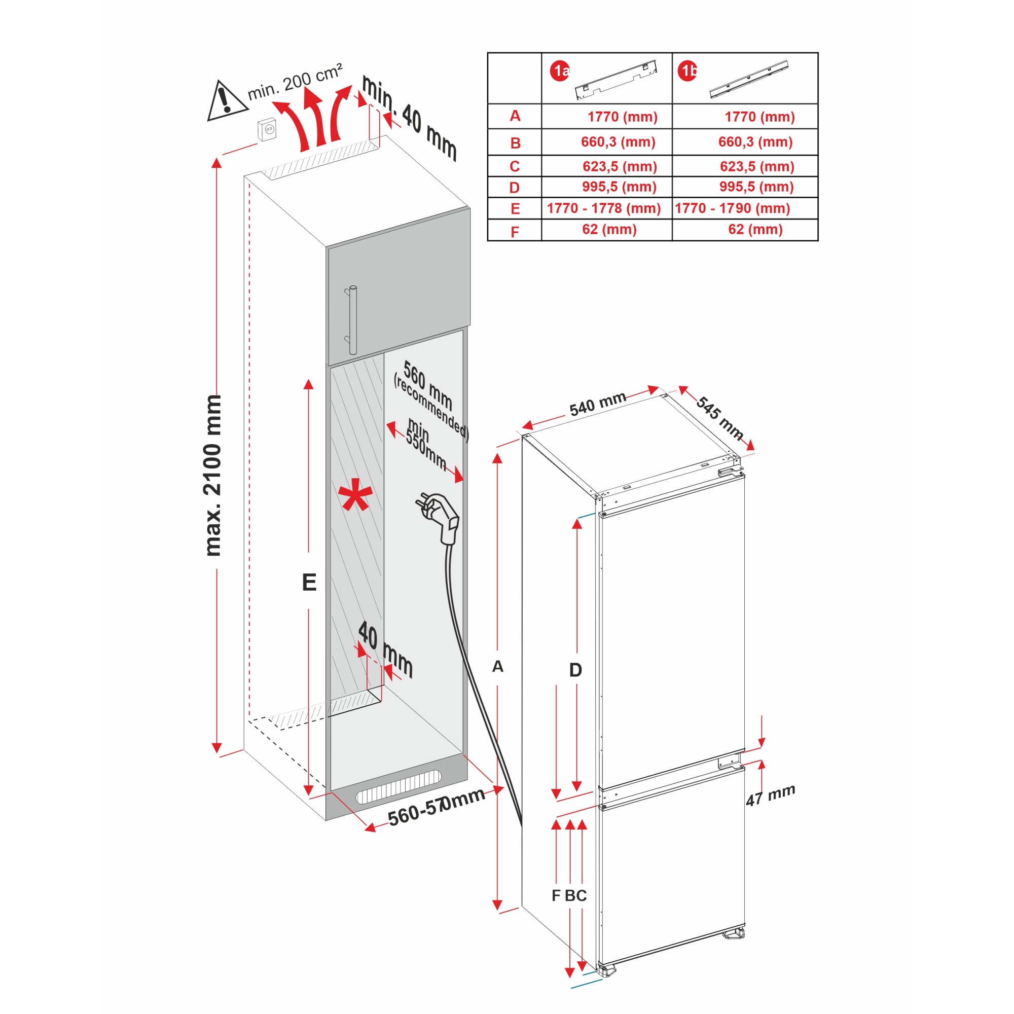 Iar dupa noua etichetare energetica adoptata la nivelul UE de la 1 Martie 2021, acest aparat frigorific se incadreaza in clasa de eficienta energetica F, cu un consum anual de energie de 271 kWh/an, masurat cu metode mai perfectionate. Iar emisiile acustice din spatiul unde este plasat aparatul frigorific este de 38 dB(A), conform noi etichete energetice. Datorita acestei modificari adoptata de la 1 Martie 2021, modelele cu cea mai mare valoare energetica A+++ sunt acum notate in clasa C (sau dupa caz), iar unele dintre aparatele cu valoarea energetica A+ sunt notate acum si pana in clasa G. Acest consum energetic i se datoreaza izolatiei termice bune si compresorului universal din dotare. Pyramis VE27RO64 este si foarte silentios, datorita sistemului elastic de amortizare a vibratiilor, avand un nivel de zgomot foarte mic de 38 dB. In plus acest aparat detine certificatul german TUV care confirma faptul ca Pyramis respecta toate standardele de constructie si siguranta specifice categoriei. Combina frigorifica incorporabila Pyramis VE27RO64 are urmatoarele dimensiuni incorporabile: (I x L x A) mm 1770 x 540 x 545 si o greutate neta de 48 Kg. Golul de montaj in mobila de la bucatarie trebuie sa aiba dimensiunile de (H, L, A)mm 1770/1778 x 560/570 x 550/560 iar panelul mobilei trebuie sa aiba o grosime de minim 20 mm. Sistemul de ventilatie al compresorului se realizeaza prin fantele de aerisire din partea superioara a mobilierului. Agentul frigorific utilizat de compresor R600a, este nepoluant si nu pune in pericol stratul de ozon din atmosfera.