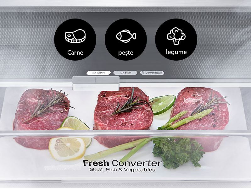 In zona de refrigerare jos se afla un compartiment specializat si Fresh Converter cu temperatura ce se poate regla de la -2°C la +3°C, de depozitare a produselor proaspete din carne, peste si legume. Acest sertar este mediul ideal pentru decongelarea produselor din congelator pregatite pentru a fi procesate. Acest raft poate fi folosit si pentru a decongela in mod lent alimentele scoase din congelator.