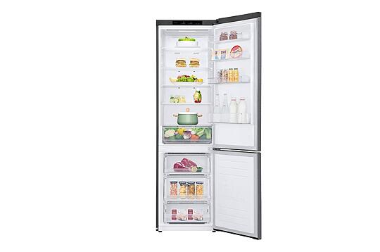 Combina frigorifica LG GBP32DSLZN cu tehnologie de racire dinamica prin ventilatie cu aer controlat uscat are un volum net generos pe frigider de 277 l precum și compartimente speciale pentru fructe, legume, pește, preparate proaspete etc. Rafturile de depozitare alimente sunt in numar de 4 realizate din sticla termorezistenta intarite cu rama din plastic ce se curăță ușor și au o rezistență foarte bună la greutăți mari. Poti plasa recipiente grele, de pana la 25 de kg, pe orice raft. Un mare avantaj al acestui model este ca pozitia rafturilor 3 din 4 poate fi ajustată după nevoi în trepte de maximum câţiva centimetri. Acest lucru este util deoarece se întâmplă frecvent ca această distanţă să fie cu câţiva milimetri mai mică decât înălţimea standard vaselor sau a borcanelor din comerţ. In plus raftul de jos articulat in doua jumatati, se poate rabata jumatatea exterioara pentru a oferi un spatiu in plus pentru produsele cu inaltime mare.