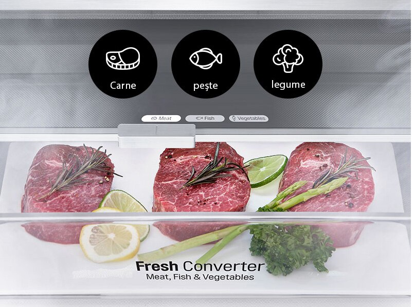 In zona de refrigerare jos se afla un compartiment specializat si Fresh Converter cu temperatura de la -2°C la +3°C, cu comutator local mecanic, de depozitare a produselor proaspete din carne, peste si legume.