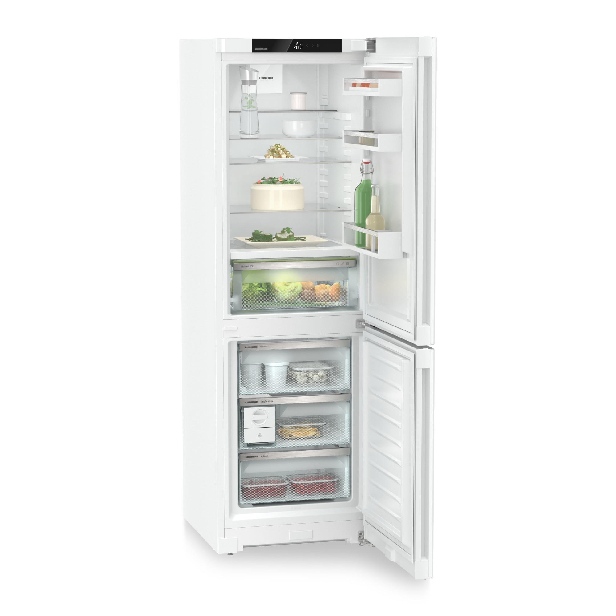 Capacitatea maxima net de 321 litri este impartita intre frigider caruia ii revin 218 litri si congelator cu un spatiu total de 103 litri. Corpul de congelare cu 4 stele, pozitionat in partea inferioara a combinei, are trei compartimente despartite de un raft din sticla. Cu sistemul Frost Safe de la Liebherr, aceste compartimente sunt spatii de depozitare foarte inalte si complet detasabile in compartimentul congelator, iar fronturile transparente ale acestor compartimente, asigura o vedere optima a produselor stocate in congelator. Sistemul de racire prin ventilare No Frost de la Liebherr din zona de congelare, asigura o racire rapida, contribuind la asigurarea depozitarii sigure si pe termen lung a alimentelor. In plus aceasta tehnologie de racire No Frost mareste capacitatea de stocare si mentine congelatorul fara gheata.