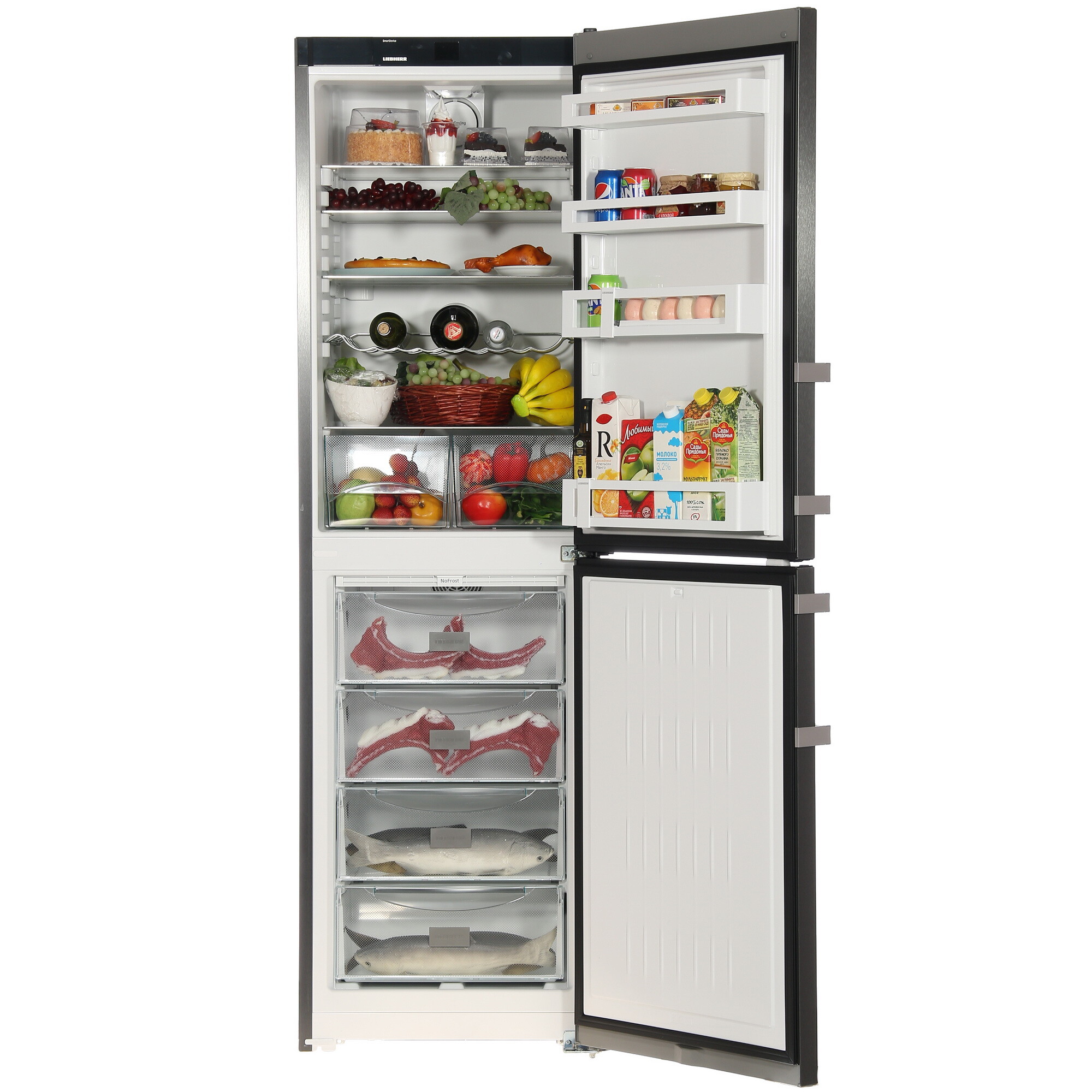 Pentru o functionalitate maxima si pentru ca respecta arhitectura traditionala aparatul frigorific a fost proiectat ca in partea de sus sa fie plasat frigiderul iar in partea de jos sa fie plasat congelatorul. Raportul dintre pret si calitatea acestui model este cel mai interesant, dintre cele mai bune marci de aparate frigorifice. Panoul de comanda digital situat in interior in partea superioara este prevazut cu un afisaj de temperatura LCD, avand butoane cu actionare touch-control, ce controleaza toate functiile aparatului. Elementele de comanda ale aparatului contin: Afisare temperatura in congelator; Afisare temperatura in frigider; Indicator avertizare pentru sectiune congelator; Temperatura reglabila pentru compartimentul congelator independent de temperatura compartimentului frigider; Temperatura reglabila pentru compartimentul congelator si frigider impreuna; Functia de Super-Frost; Super Cooling; Functia Frost Control; Buton On/Off pentru sectiunea de refrigerare; Buton On/Off pentru sectiunea de congelare; Modul Sabbath; Semnal avertizare usa deschisa; Functia de blocare panou de comanda. Odata pornita combina ecranul ne arata: Meniul principal; Optiunea selectata. Iar campul din meniu ofera acces optim la optiunile aparatului si la setari. Optiunile selectate sunt de asemenea afisate. Pentru a naviga pe panoul de comanda, atingeti meniul pentru a accesa optiunile individuale. Un semnal sonor se aude dupa confirmarea unei optiuni sau a unei setari. Aparatul functioneaza si utilizand urmatoarele functii: Tehnologia inteligenta a combinei face posibila reducerea consumului de energie electrica de la 4-5 W la 0,5 W in stand-by, conducand la o economie importanta de energie. Cu setarile de plus si de minus putem sa setam temperatura din zona de refrigerare si de congelare. Astfel frigiderul ofera un interval cuprins intre 2°C si 9°C, in timp ce temperatura din congelator poate varia intre -16°C si -32°C. Iar functia Frost Control ne va arata pe afisaj cea mai ridicata temperatura atinsa in compartimentul congelator, dupa o cadere de tensiune. Acesta functie ne poate ajuta sa extimam calitatea de conservare prin inghet si a duratei de valabilitate a produselor alimentare depozitate in congelator, dupa o cadere de tensiune de pe reteaua de alimentare cu energie electrica. Programul Child Lock permite blocarea comenzilor combinei pentru a preveni pornirea accidentala sau modificarea parametrilor de catre copii in timp ce aparatul este in functiune. Cu sistemul de racire No Frost Liebherr raceste zona de refrigerare si de congelare, in mod uniform, dintr-o parte in alta cu ajutorul a doua ventilatoare. Aerul rece ce este suflat de ventilator in zona de refrigerare, mentine o temperatura constanta, cu o diferenta de nu mai mult de 1-2 grade dintre rafturile superioare si inferioare, ceea ce asigura o mai buna siguranta a produselor, iar mancarea ramane mereu proaspata.