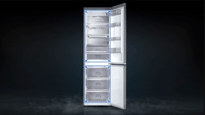 Aparatul avand debit multiplu ce functioneaza la toate nivelele, prin intermediul unor mici orificii de ventilare de pe fiecare raft, pastreaza o temperatura uniforma in tot frigiderul, in special dupa ce deschidem usa. Prin racirea simultana multipla a tuturor sectiunilor si ale tuturor compartimentelor, alimentele pot ramane proaspete mai mult timp. Aceasta combina fiind dotata cu sistemul avansat de racire Precise pastreaza prospetimea, aroma si textura alimentelor depozitate pentru mai mult timp. In acest caz zonele din combina sant racite independent si in mod egal in fiecare colt. Iar izolatia avansata din cyclopentan reduce orice fluctuatii de temperatura, indiferent de cat de cald sau de frig este afara.
