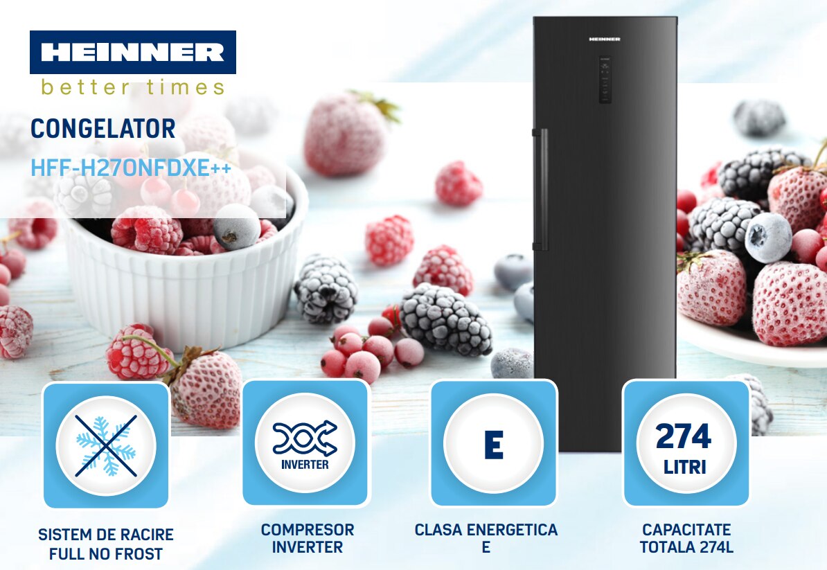Pe partea de functii si tehnologie Heinner HFF-H270NFDXE++ detine: Sistem de avertizare acustic atunci cand usa este deschisa, mai mult de 300 secunde. Semnal optic şi sonor de avertizare la creşterea temperaturii in congelator dupa o pana de curent. Dupa o functionare timp de 3 ore si daca temperatura este mai mare de -8℃, afisajul LED va indica un cod (ht) si temperatura reala in congelator, avertizand-une si printr-un semnal sonor cu o frecvență de 1Hz, pana la apasarea oricarui buton de pe display. Acest congelator este dotat si cu tehnologia Freezer Shield ce asigura pastrarea in siguranta a alimentelor in congelator, chiar daca temperatura ambientala scade la -15°C. Fiind dotat cu aceasta tehnologie puteti instala congelatorul si intr-o camera neincalzita, fara sa va faceti griji ca alimentele se vor dezgheta. Congelatorul are in dotare si patru compartimente de jos cu functia automata Super Frost unde procesorul reduce rapid temperatura la -25°C si astfel alimentele pastreaza toate vitaminele. Dupa 50 de ore de indata ce mancarea este complet inghetata, functia automata Super Frost comuta inapoi la modul normal in functie de gradul de incarcare, si astfel ajuta la economisirea energiei electrice. In continuare putem sa mutam alimentele deja inghetate in rafturile de sus. Heinner avand functia de congelare automata revine la functionarea normala imediat ce se atinge temperatura necesara. In acest fel se previne risipa de energie. La modul de functionare ECO pictograma cu modul de functionare in regim ECO se aprinde, iar fereastra de pe afisaj va indica diferite temperaturi de racire ce pot fi accesate in spatiul de racire, in functia de temperatura ambientala si de locul unde este plasat congelatorul. Astfel daca temperatura din spatiul unde este plasat congelatorul este egala sau mai mica de +13°C, in spatiul de racire din congelator este indicat sa accesat temperatura de -18°C. Iar daca temperatura din spatiul unde este plasat congelatorul este mai mare de +35°C, in spatiul de racire din congelator este indicat sa accesat temperatura de -15°C. Aparatul are in dotare senzori Fresh Sense ce monitorizeaza in mod constant temperatura ambianta si pe cea din aparat. Rezultatul este o temperatura constanta in interiorul aparatului, independent de temperatura exterioara.