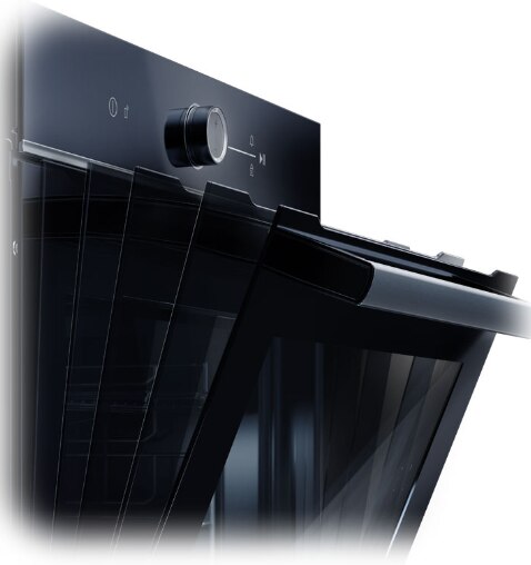 Cuptorul cu control mecanic/electronic are un design modern, de culoare negru, iar materialul din care este construit este inox/sticla. Acest model iese de asemenea in evidenta si prin tehnologia avansata pe care se bazeaza, si care ii asigura performante inalte la gatit cu cel mai mic consum posibil. Afisajul LED cu actionare full touch control de dimensiuni generoase pozitionat frontal, impreuna cu programatorul digital, actionat de butoane senzitive, indeplinesc functiile de: setare temperatura, timer si selector de programe. Programatorul digital cu display faciliteaza navigarea in meniu, cu simboluri usor de citit si afiseaza cu desen grafic functia de gatit selectata. In centrul panoului de comanda se afla butonul rotativ de setare Meniu, unde avem posibilitatea sa selectam toate functiile din dotarea cuptorului. Functiile setate vor fi prezentate si pe ecranul LED cu ajutorul pictogramelor sugestive fiind in plus si notificati parametri de functionare. Pornirea si oprirea cuptorului se face cu ajutorul tastei senzitive On/Off. Deruland functiile din dotare cu ajutorul butonului rotativ observam ca acest cuptor are in dotare si 15 programe. Iar nivelele de temperatura selectate sunt: Cuptor cu incalzire lenta cu temperatura de lucru de la 40°C – 100°C; Cuptor cu incalzire moderat lenta cu temperatura de lucru de 100°C – 150°C; Cuptor cu incalzire lenta cu temperatura de lucru de 150°C – 200°C; Cuptor cu incalzire rapida cu temperatura de lucru de 200°C – 250°C; Cuptor cu incalzire rapida/foarte fierbinte cu temperatura de lucru de 250°C – 280°C. Iar cu ajutorul programatorului cu functia de ceas, monitorizarea timpului de preparare de maxim 120 de minute si setarea timpului de oprire a cuptorului se realizeaza deosebit de usor. In acest sens programatorul electronic este prevazut cu senzori electronici care sunt activati prin simpla atingere a suprafetei de cel putin o secunda. Fiecare activare a senzorului este confirmata si de un semnal sonor. In primul rand cand porniti cuptorul prima data selectati limba, iar cu ajutorul functiei de ceas fixati si ora curenta. Iar cronometrul din dotare este utilizat pentru numaratoare inversa. Aceasta functionare a cronometrului nu are nici o influenta asupra functionari cuptorului. In acest sens cronometrul poate fi setat oricand chiar daca cuptorul este oprit. In schimb cronometrul cu numaratoare directa monitorizeaza automat timpul pentru care cuptorul este activ. In acest sens cronometrul este activat simultan cu incalzirea cuptorului. Cand timpul setat pentru durata de coacere se finalizeaza, cuptorul se opreste automat si emite si un semnal sonor timp de 2 minute, iar durata setata apare si pe afisaj. Pentru a anula semnalizarea sonora se deschide usa cuptorului sau accesati buton de selectare functii de coacere in pozitia oprit. Setarea functiei de temporizare este folosita atunci cand dorim ca cuptorul sa porneasca mai tarziu. In acest sens, setam in primul rand functia de coacere, durata de coacere si ora curenta de finalizare a ciclului de coacere. Dupa aceste manevre, cuptorul porneste automat mai tarziu si functioneaza cat timp am setat durata de coacere si se opreste la ora setata la sfarsit. Pentru a porni cuptorul la inceput fixati temperatura de coacere si modul de preparare. Pornirea cuptorului este semnalizata si prin aprinderea a doua semnalizari de control. Prima semnalizare ne indica starea de functionare. Iar stingerea acestei diode semnalizeaza ca, cuptorul a atins temperatura setata. Astfel pe timpul functionari cuptorului, aceasta dioda se va aprinde sau se va stinge periodic. Cu functia de gatire Eco acest cuptor functioneaza cu resurse energetice reduse. In acest scop sistemul dublu de iluminare cu halogen al cuptorului este oprit si nu este permis sa deshizi usa in timpul ciclului de coacere. La functia de coacere Manual este nevoie sa setam manual functia de coacere, temperatura de coacere si durata. La functionarea Automata functiile de coacere sunt selectate in functie de tipul si greutatea produsului. Aceste retete se gasesc in sectiunea de meniuri secundare: Carne; Pui; Peste; Desert; Pizza; Patiserie; Vegetarian. Acest cuptor fiind dotat cu un procesor performant are stocat in memorie si sfaturi de gatit date de un maestru bucatar. Retetele prezentate de acest bucatar profesionist sunt explicate pas cu pas cu temperatura de coacere, pozitia raftului de coacere, avand suport si imagini ale acestor retete. Acest cuptor fiind proiectata pentru o functionare indelungata pe afisaj vor aparea si coduri de eroare. In acest sens cu functia de Diagnosticare Inteligenta din dotare acest model are rolul de a preveni defectiunile severe care pot sa apara. Aceasta functie va identifica inca din faza incipienta orice eroare aparuta in regimul normal de functionare si va opri instantaneu cuptorul, afisand in acelasi timp pe display-ul acesteia un cod specific fiecarei erori. In functie de aceste coduri afisate ce sunt prezentate si in manualul cuptorului, veti putea gasi cele mai rapide si mai sigure metode de remediere. In plus programul Child Lock permite blocarea electronica a comenzilor cuptorului pentru a preveni pornirea accidentala sau modificarea parametrilor de catre copii in timp ce cuptorul este in functiune. Acest aparat este dotat si cu tehnologia Home Whiz, prin accesarea butonului Remote Control care te ajuta sa monitorizezi si sa gestionezi toate electrocasnicele din casa folosind telefonul, tableta sau televizorul tau smart, prin aplicatia Bluetooth. De asemenea aceasta aplicatie iti ofera posibilitatea de a vizualiza notificarile si avertizarile in timp real, oferind-uti informatii despre starea tehnica a cuptorului, cum ar fi ca alimentarea de la reteaua de energie electrica este oprita. Pentru a utiliza aceasta functie trebuie sa descarcati aplicatia necesara cu denumirea Home Whiz din lista de aplicatii al dispozitivului dv. inteligent. Puteti utiliza App Store pentru dispozitivele mo