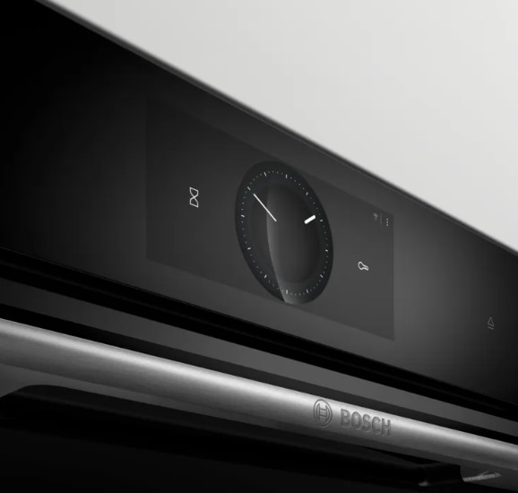 In plus acest model de la Bosch avand un procesor performant are capacitatea de a propune timpul si temperatura de coacere, pentru diferite retete culinare. Pentru un plus de confort cu ajutorul butonul senzitiv de control inteligent puteţi controla cuptorul electric si de la distanta, folosind aplicatia Smart Things Cooking, cu ajutorul unui telefon inteligent sau cu o tableta Android sau iOS. Astfel cu aplicatia din dotare Smart Things recomanda modul de coacere pentru preparatele preferate, iar pentru un plus de confort va sugereaza si retete delicioase prin crearea unui plan de servit masa saptamanal. De asemenea, oferă o experiență de gătit ghidată. Pentru a utiliza aceasta functie trebuie sa descarcati aplicatia necesara cu denumirea Home Whiz din lista de aplicatii al dispozitivului dv. inteligent. Puteti utiliza App Store pentru dispozitivele mobile iPhone, iPad si Google Play Store pentru dispozitivele mobile care folosesc sistemul de operare Android OS 8.0 (Oreo TM). Dupa ce ati selectat o functie de gatire aveti si posibilitatea sa salvati functia, in lista de functii Favorite cu 30 de pozitii, prin intermediul aplicatiei Home Connect. Astfel dupa ce cuptorul este conectat la aplicatie, puteti sa urmati instructiunile din cadrul aplicatiei. Iar pentru un plus de confort aplicatia are si un asistent vocal Amazon Alexa, ce te indruma si iti da indicatii cum sa folosesti acest cuptor inteligent. In plus utilizatorul poate folosi acest program si pentru a accesa functia Smart Diagnosis, iti permite sa suni la linia de asistenta tehnica, pentru a face o programare, in vederea unui diagnostic al aparatului de la distanta, daca eventual intre timp apare o problema de natura tehnica. Obtinand programarea, departamentul de service Bosch poate verifica de la distanță cuptorul, poate a face un diagnostic tehnic si a te indruma mai departe. In cazul in care problema tehnica nu poate fi rezolvata pe loc, un tehnician de service Bosch, va veni la tine acasa, pentru a rezolva problema tehnica, avand toate piesele de rezerva necesare. Pentru a beneficia de aceasta aplicatie este nevoie sa consultati instructiunile de utilizare Bosch @ home. Programul Child Lock permite blocarea butoanelor cuptorului pentru a preveni oprirea accidentala sau schimbarea programului. Copiii se pot juca langa cuptor, fara ca sa fie supravegheati permanent. Aceasta interfata cu butoane moderne, ofera acces direct la temperatura si la modurile de incalzire practice.