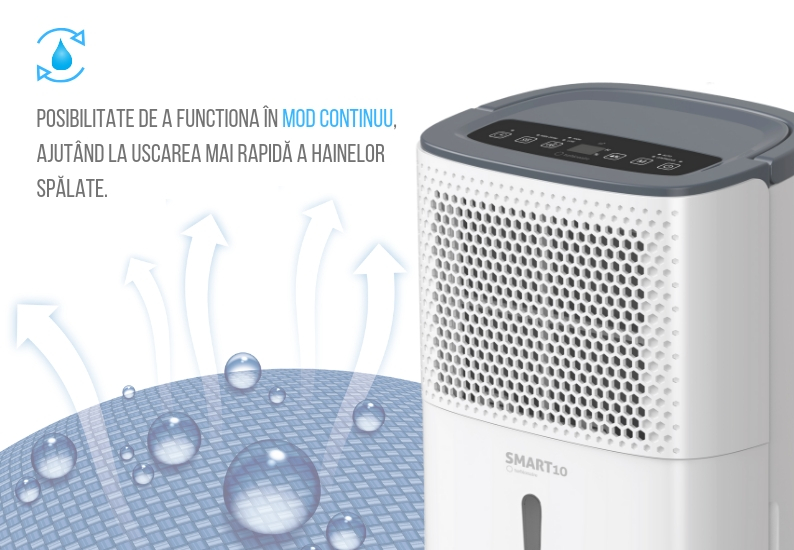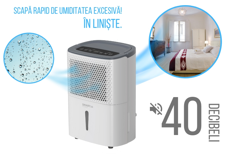 Pe partea de funcții, modelul dispune de urmatoarele imbunatatiri: Aparatul de dezumidificare Smart 10 Eco are o funcţiune complet automata de dezumidificare si ventilare, pentru a realiza un ambient optim in spatiul unde este amplasat. Aparatul cantareste 10 kilograme si are urmatoarele dimensiuni de: (L x H x A)mm 296 x 416 x 217. Agentul refrigerant folosit in instalatia de dezumidificare este R290 si face parte din grupa glimerilor (un amestec de mai multe gaze care au temperaturi diferite de vaporizare) si care lucreaza la presiuni si temperaturi mai ridicate dar nu au nevoie de un compresor de capacitate mare. Dupa ce ati achizitionat acest aparat si la-ti adus acasa aparatul se porneste dupa maxim 24 de ore pentru a da posibilitate agentului frigorific sa se acumuleze de pe circuit in compresor. In caz contra compresorul se poate deteriora din cauza cantitatii insuficiente de agent frigorific in compresor. Daca compresorul se deterioreaza din acest motiv firma producatoare nu acorda garantie la acest produs.