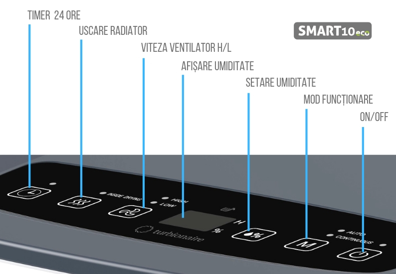 Eficienta energetica oferita de Turbionaire Smart 10 Eco- 10 l/24h este buna, acesta fiind incadrat in clasa A, cu un consum maxim de 200 W/h. Aparatul deține un senzor cu higrostat reglabil și face posibil un control permanent al umidității din aer. Depășirea valorii de umiditate setate duce la pornirea automată a aparatului. Imediat ce umiditatea dorită a fost atinsă, aparatul se deconectează automat. Pentru ca senzorul din dotare sa poata masura corect umiditatea din incapere, ventilatorul aparatului funcționeazaă permanent, pana ce higrostatul din dotare constată atingerea umidității setate, deconectand automat aparatul. Smart 12 este indicat sa fie folosit in spatiul unei incaperi unde temperatura este cuprinsa intre 5°C – 35°C, cu domeniul de functionare intr-un spatiu cu umiditate de 30% – 80 % u.r. Instalatia de filtrare permanenta cu aer include un pre-filtru de tip HEPA lavabil. Acest filtru cu 3 straturi elimina eficient particulele de praf, polen si scame. Pentru persoanele cu alergii si probleme respiratorii, aceste sistem de filtrare poate oferi o solutie foarte buna. Acest sistem de filtrare este bine sa fie curatat saptamanal cu apa calduta pentru ca performantele de filtrare si de dezumidificare sa se mentina constant.