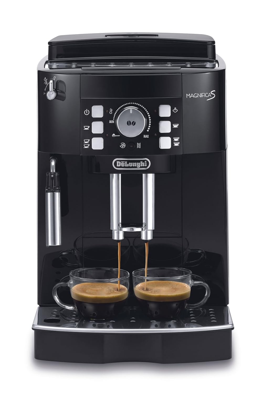 Cafeaua se prepară complet automat, putând seta espressorul chiar și printr-o singură apăsare de buton atunci când folosești setările memorate. Indiferent daca vrei un cappuccino sau o spuma de lapte, bautura ta preferata va fi gata in cateva secunde si exact la temperatura potrivita, datorita boilerului cu incalzire rapida. Spuma de lapte fierbinte este exact asa cum iti place, gratie sistemului clasic de spumare a laptelui. O functie utile este aceea ca aparatul printr-o simpla acesare alege rapid cantitatea de cafea boabe pentru a fi macinata, pentru a obtine un espresso cu concentratie mai tare sau mai slaba. Distribuitor este reglabil pe inaltime in functie de dimensiunea cupei de cafea de la 86 mm la maxim 142 mm. Acest aparat avand un compartiment de cafea de 250 grame accepta atat cafea boabe cat si cafea macinata. Deasupra aparatului se afla si o plita care va mentine, calde, cestile de cafea goale. De’Longhi Magnifica S ECAM 21.117.B este dotat cu o unitate de macinare profesionista Burr, din inox de inalta calitate care macina cafeaua la unul dintre cele 13 niveluri disponibile, fin si uniform in functie de gradul de setare. De obicei oamenii, obisnuiesc sa consume numai cafea boabe, macinata de ei sau de espressor, pentru a pastra gustul aromat si irezistibil al cafelei. Cu acest model de rasnita, boabele isi vor pastra aroma naturala, iar cafeaua rezultata va avea gustul pe care ni-l dorim. Rasnita de cafea functioneaza cu aproximativ 64 dB(A) destul de tare, dar se incadreaza la un nivel moderat tolerabil. Daca preparati o bautura cu cafea premacinata, folositi masura de cafea ce insoteste acest model pentru a pune doza corecta in compartimentul pentru cafea premacinata. Iar pe ecran va fi afisat un avertisment grafic atunci cand compartimentul de cafea incepe sa se goleasca.