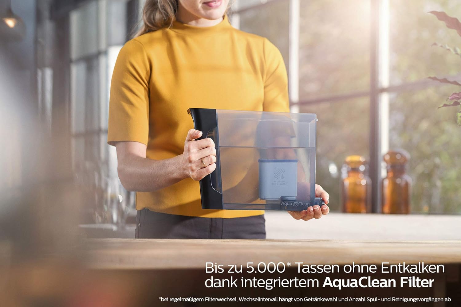Aparatul avand o capacitate mare de stocare apa, putem obtine in final o gama variata de bauturi. Pentru a obtine rezultate bune in pregatirea bauturilor preferate rezervorul de apa este dotat cu un filtrul de apa Aqua Clean, performant cu anduranta mare ce garanteaza ca vei profita la maximum de cafetiera complet automata. Dupa ce prin filtru curg in jur de 95 de litri de apa, filtrul inceteaza sa mai functioneze. In acest sens semnalizarea luminoasa Aqua Clean de pe panoul de comanda se coloreaza in portocaliu si incepe sa clipeasca pentru a va atentiona ca trebuie sa inlocuiti filtrul. Atat timp cat semnalizarea clipeste, puteti sa inlocui filtrul fara sa trebuiasca sa detartrati mai intai aparatul. Daca amanati procedura de inlocuire a filtrului, la inlocuirea cu noului filtru trebuie sa executati mai intai si procedura de detartare. Dupa ce a-ti inlocuit filtrul de apa, lumina portocalie se stinge. Daca nu mai doriti sa mai utilizati filtrele de apa marca Philips Aqua Clean, puteti sa dezactivati functia Aqua Clean.
