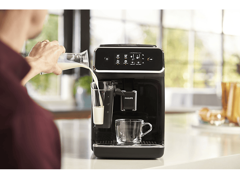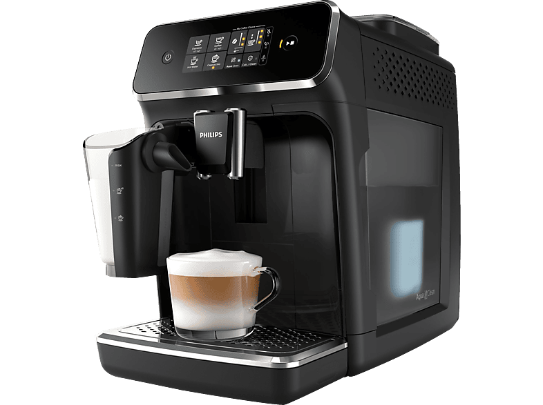 Pe ecran va fi afisat si un avertisment grafic atunci cand compartimentul de cafea incepe sa se goleasca. Semnul grafic cu (boabe de cafea cu doua linii rosi incrucisate) ne arata ca compartimentul de cafea este complet gol si masina se opreste automat. Iar daca doriti o cafea pre-macinata deschideti capacul compartimentului de cafea pre-macinata si turnati o doza de cafea pre-macinata, pentru a pregati numai o cafea. Camera de percolare a acestui model permite un debit variabil de cafea, ce poate varia intre 6 si 9 grame in functie de bautura selectata. Puterea de 1850 W claseaza acest aparat in topul espressoarelor de putere peste medie, dar a fost luat in consideratie si aspectul consumului, astfel ca espressorul incalzeste numai cand e necesar si mai exista un comutator care deconecteaza aparatul complet de la retea. Acest model are in dotare Sistemul Latte Go format dintr-o carafa de lapte cu capacitatea de 0,250 litri. Acest sistem inovator este format doar din 2 componente, fara tuburi, ce pot fi spalate in doar 15 secunde sau direct in masina de spalat vase. Este suficient sa torni lapte in carafa si sa iti selectezi bautura preferata. Sistemul produce o spuma catifelata de lapte datorita camerei de spumare de mare viteza, unde marimea bulelor este redusa, rezultand o spuma de lapte densa si fina. Productia de spuma inceteaza automat dupaă 90 de secunde. Astfel indiferent daca vrei un cappuccino sau o spuma de lapte, bautura ta preferata va fi gata intr-un timp scurt.