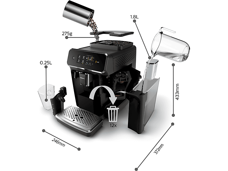 Un tub de lubrefiant special este inclus in produsul care insoteste oferta. Aparatul Philips EP2231/40 are urmatoarele dimensiunii: (L x A x H): 246 x 372 x 433 mm si o greutate de 8 Kg. Consumul de energie in modul de asteptare este de 0,5 W/h, iar consumul anual de energie este de 68 kWh/an. Acest model vine insotit si de: Manual cu instructiuni de siguranta; Cartus Claris Aqua Filter System cu accesoriu de insurubare; Un bastonas pentru a stabili duritatea apei; Manual de utilizare; Registru cu centrele de service post vanzari Philips; Documente de garantie: Un set de curatare si intretinere format dintr-o solutia de decalcificare CA6700, vaselina pentru grupul de percolare si tablete de degresare pentru cafea CA6704.