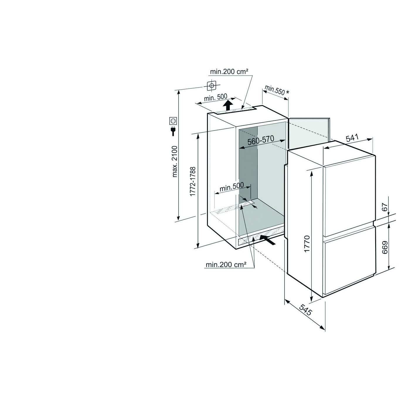 Acest consum energetic i se datoreaza izolatiei termice bune din cyclopentane si a compresorului cu functie Inverter amplasat jos, care fac totul posibil ca energie consumata sa fie mica. Aceasta tehnologie reduce zgomotul, creste volumul utilizabil si imbunatateste eficienta energetica. Tehnologia Inverter de la Liebherr presupune modificarea turației și capacității compresorului pe 7 nivele a aparatului de refrigerare în funcție de anumiți parametri. Astfel la pornirea aparatului procesorul comandă compresorului o turatie si o capacitate maxima, pentru atingerea rapidă a temperaturii dorite. Odată ce această temperatură a fost atinsă, procesorul comandă compresorul să-și reducă turația și implicit capacitatea la valori minime, asigurand menținerea temperaturii setate. Acest model fiind dotat cu tehnologia Inverter este si foarte silentios, avand un nivel de zgomot foarte mic de 35 dB. Volumul total net a acestui aparat frigorific de la Liebherr este de 264 litri din care 183 litri ii revin frigiderului iar restul de 81 de litri congelatorului. Frigiderul cu congelator Liebherr ICSe 5103 Pure are urmatoarele dimensiuni incorporabile: (I x L x A) mm 1770 x 541 x 545 si o greutate neta de 59 Kg. Iar golul de montaj in blatul de la bucatarie trebuie sa aiba dimensiunile de (H, L, A)mm 1772/1788 x 560/570 x 550 iar blatul trebuie sa aiba o grosime de minim 25 mm.