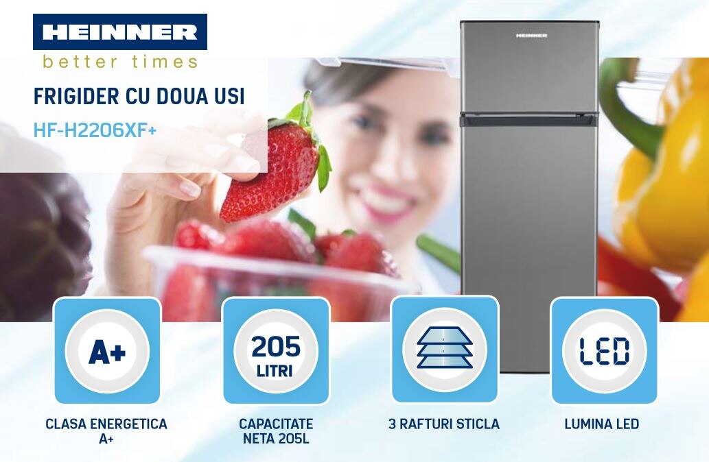 Frigiderul cu doua usi Heinner HF-H2206XF+ este un aparat cu doua usi, cu suprafata emailata de culoare Inox, ce imita inoxul, cu picioruse reglabile foarte elegant si cu un aspect modern. Liniile simple il recomanda pentru absolut ori si ce bucatarie. Pentru o functionalitate maxima aparatul a fost proiectat ca in partea de sus sa fie plasat congelatorul iar in partea de jos sa fie plasat frigiderul. Panoul de comanda clasic cu control manual al temperaturi, se afla in interiorul aparatului, pe partea dreapta. Pe panoul de comanda sunt disponibile 5 trepte de temperatura. Intervalul de temperatura ce poate fi reglat este de: 2°C pana la 8°C in zona de refrigerare si de -10°C pana la -18°C din zona de congelare.