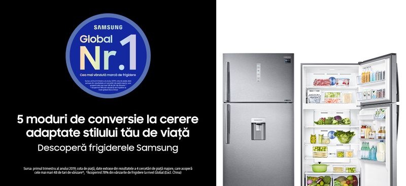 Pentru o functionalitate clasica aparatul a fost proiectat ca in partea de sus sa fie plasat corpul de congelare iar in partea de jos sa fie plasat corpul de refrigerare. Samsung RT50K6335SL/EO este un frigider practica dotata cu tehnologia de racire Full No Frost perfecta pentru o familie numeroasa, pentru a impiedica depunerile de gheata. Mai mult, mentinand o temperatura constanta in spatiul de refrigerare, tehnologia No Frost necesita mai putina energie, crescand astfel durabilitatea sistemului de racire. Iar tehnologia Space Max cu pereti subtiri si cu izolatie din cyclopentan de la Samsung oferă un spatiu de stocare mai mare. Tot acest spatiu suplimentar ne ajută să stocam mai multe alimente si băuturi, să organizam alimentele în ordine, făcându-le mai usor de găsit si să facem mai putine drumuri la supermarket. Samsung cu un compresor puternic, permite funcţionarea independentă a frigiderului şi a congelatorului, fiind dotat cu tehnologii de varf, perfect pentru o familie numeroasa, cu diverse preferințe culinare. Controlul precis si individual al temperaturii pentru compartimentul de refrigerare si compartimentul de congelare al frigiderului Samsung este obtinut prin sistemul Twin Duo Cooling Plus system prezent la acest model cu doua circuite de racire reglabile complet separat. In plus, cu sistemul Twin Duo Cooling Plus se elimina transferul mirosurilor si se opreste deshidratarea produselor depozitate, nu exista posibilitatea ca aerul sa circule intre compartimentul de refrigerare si cel de congelare.