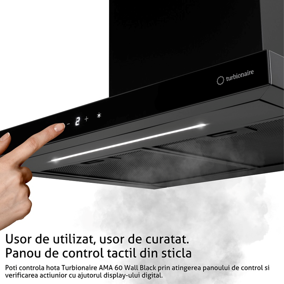 Hota incorporabila decorativa Turbionaire Ama TMA60WB are in dotare elemente constructive telescopice, ce culiseaza pe verticala. La acest model marimea pe verticala a corpului poate fi extinsă la utilizare, fiind reglata la o distanta adecvata fata de zona de arzatoare. In functie de modul de montare a traseului de evacuare a aerului din bucatarie, pana la o valoare a tirajului ce depinde de temperatura din exterior, poate face fata solicitarilor si fara pornirea ventilatorului electric, functionand pe baza tirajului natural. Hota are un design modern, de culoare negru antracit, iar materialul din care este construita hota este otel inox AISI 430 vopsita electro-static si sticla.