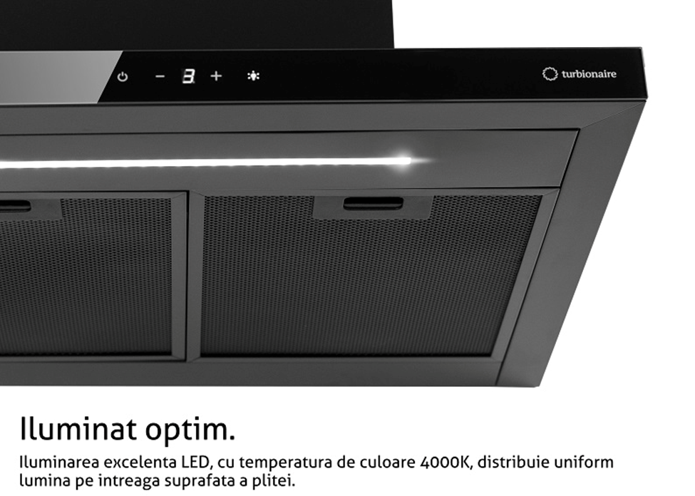 Acest model iese de asemenea in evidenta si prin tehnologia avansata pe care se bazeaza, si care ii asigura performante inalte la evacuarea aerului viciat din bucatarie, cu cel mai mic consum posibil. Panoul de comanda electronic pe suport din sticla neagra, pozitionat frontal, cu ecran LED, indeplinesc functiile de: Pornire/oprire; setare treapta de aspiratie si comutator sistem de iluminare. Astfel cu ajutorul butonului notat cu semnul grafic de (+) si (-) selectam treapta de ventilare. Temporizatorul programator din dotarea hotei se activeaza sau se dezactiveaza prin apasarea concomitenta a celor doua butoane senzitive natate cu semnul grafic de (+) si (-). Din acel moment afiseajul clipeste si numaratoarea inversa incepe timp de maxim 5 minute. Dupa epuizarea timpului de 5 minute, motorul si sistemul de iluminare se vor opri automat, iar o semnalizare sonora va anunta acest lucru. Aceasta semnalizare sonora se poate opri prin apasarea oricarui buton de pe panoul de comanda. Daca este nevoie sa opriti hota mai devreme de intervalul de timp de 5 minute se repeta apasarea concomitenta a celor doua butoane notate cu semnul grafic de (+) si (-). Aceasta interfata cu butoane senzitive ofera acces direct la functionarea hotei in bune conditii.