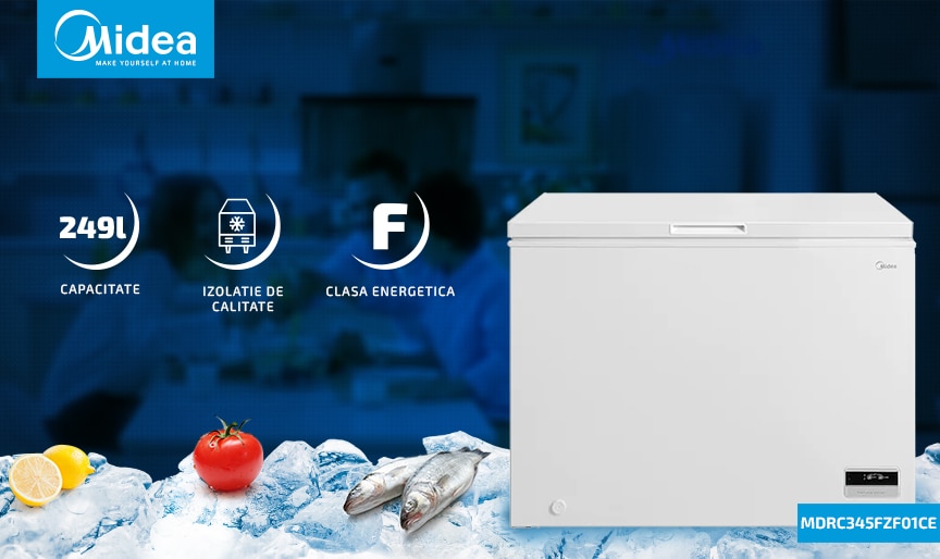 Procedura de dezghetare a acestei lazi frigorifice de la Midea a fost mult usurata prin realizarea din punct de vedere constructiv a unui sistem de drenare la dezghetare, cu evacuare a condensului rezultat afara. Compresorul din dotarea acestei lazi are inclus si o unitate de condensare integrata cu un evaporator de congelator ascuns in carcasa. Lada frigorifica Midea MDRC345FZF01CE detine tehnologia de racire si congelare statica Frost Less. Constructiv la acest sistem de racire traseul vaporizatorului este integrat sub invelisul interior al lazi frigorifice si transfera temperatura scazuta direct catre peretii interiori ai aparatului frigorific. Aceasta tehnologie reduce formarea de gheata si dezghetarea manuala cu pana la 50%. In afara de faptul ca va fi necesar mai putin efort la dezghetare, cu sistemul Frost Less veti economisi si energie. Pentru o protectie eficienta antibacteriana, garnitura de pe capac, montata pentru etansare, contine aditivi speciali care previn formarea bacteriilor. Midea cu un singur compresor si un singur circuite de racire este un aparat frigorific practic dotat cu tehnologii de varf fiind perfect pentru o familie de marime mai mica cu diverse preferințe culinare. Midea are un sistem de racire static conceput pentru a mentine temperatura optima in lada frigorifica, indiferent cat de des se deschide usa capac. Acest model cu tehnologie de racire statica are un volum net pe aparat de 249 l. De pe panoul de comanda electronic cu ecran LCD avem posibilitatea de a setam cu ajutorul tastelor senzitive nivelul de temperatura din interiorul lazi frigorifice in doua moduri de functionare: de refrigerare sau de congelare. Cand setati aparatul frigorific la modul de refrigerare lada functioneaza ca un frigider unde temperatura interioara poate fi setata intre +0°C si +6°C. Iar cand setati aparatul frigorific la modul de congelare lada functioneaza ca un congelator, iar temperatura interioara poate fi setata intre -14°C si -22°C. Aceasta lada este dotata si cu functia de Super Frost. Atunci cand utilizati lada la modul de refrigerare si nu de congelare, este nevoie sa va asigurati ca functia de congelare rapida nu este activata, pentru a evita spargerea recipientelor din sticla depozitate cu lichide. Pentru o depozitarea pe termen lung a alimentelor congelate se recomanda o temperatura de cel putin -18°C. Programul Child Lock permite blocarea butoanelor lazi frigorifice prin apasarea concomitenta a doua butoane de temperatura si de activare a functiei de Super Frost timp de 3 secunde pentru a preveni oprirea accidentala sau schimbarea programului. Copiii se pot juca langa lada frigorifica, fara ca sa fie supravegheati permanent. Aceasta lada frigorifica fiind proiectata pentru o functionare indelungata pe afisaj vor aparea si coduri de eroare. In acest sens cu functia de Diagnosticare Inteligenta din dotare acest model are rolul de a preveni defectiunile severe care pot sa apara. Aceasta functie va identifica inca din faza incipienta orice eroare aparuta in regimul normal de functionare, afisand in acelasi timp pe display-ul acesteia un cod specific fiecarei erori. In functie de aceste coduri afisate ce sunt prezentate si in manualul lazi frigorifice, veti putea gasi cele mai rapide si mai sigure metode de remediere. Capacitatea de congelare a aparatului frigorific este de 12 Kg de carne sau alte produse alimentare in 24 de ore, datorita functiei speciale Super Frost, reglabil in functie de timp. Functia automata Super Frost realizeaza congelarea simpla si economiseste timp si energie. Aceasta functie reduce rapid temperatura la -22°C si astfel aerul rece pastreaza vitaminele din alimente. De indata ce mancarea este complet inghetata, functia automata Super Frost comuta inapoi la modul normal dupa maxim 24 ore in functie de incarcatura, si astfel ajuta la economisirea energiei electrice. Aceasta functie este de obicei folosita pentru a ingheta cantitati mai mari de alimente. In cazul unei pene de curent datorita izolatiei termice foarte bune, autonomia de congelare dureaza pana la 24 de ore, timp pana cand aceasta isi pierde toata racoarea de la interior si se dezgheata. Acest model cu un compresor a fost proiectat pentru a functiona normal si fara risipa de energie in anotimpul calduros intr-un spatiu cu temperatura mediului ambiant avand o clasa de climatizare, N-SN-ST-T, fiind proiectat sa functioneze economic in intervalul de temperaturii fara sa se suprasolicite de la +16°C in regim de iarna până la +43°C in regim de vara. Este un aspect foarte important la achiziţionarea unui astfel de aparat frigorific si mai ales la alegerea locului de amplasare a acestuia in locuinta, fiind preferabil evitarea încăperilor calde, cum ar fi de exemplu bucataria.