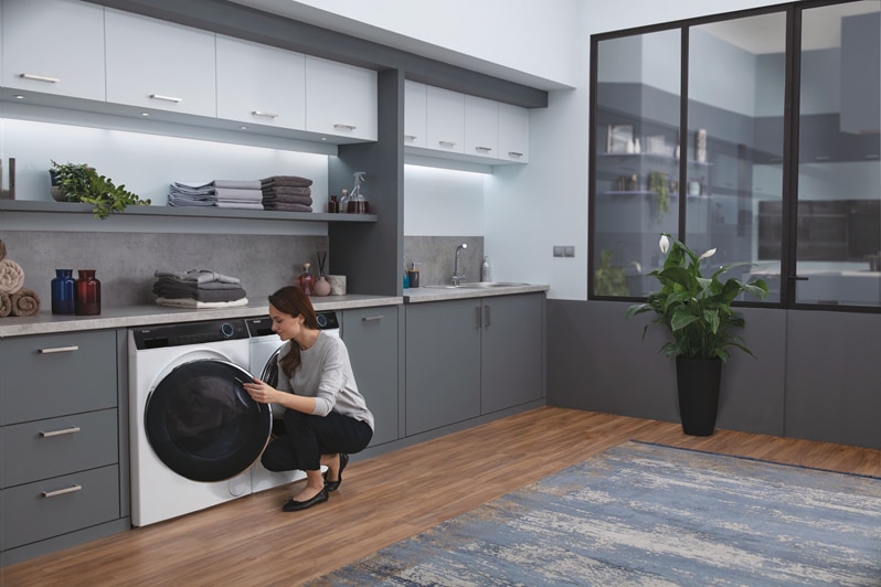 In stanga panoului de comanda se afla sertarul Stay Clean cu 5 compartimente pentru detergent solid, lichid, pentru dezinfectant sau balsam ce ofera posibilitatea de a utiliza la spalare detergent lichid sau concentrat, in functie de preferinta utilizatorului. In plus cu ajutorul tehnologiei Smart Dosing si a senzorilor speciali aceasta masina determina in mod automat cantitatea optima de detergent si balsam de rufe necesare unui ciclu de spalare, in functie de cantitatea de rufe, gradul de murdarire si tipul de material, beneficiind de o spalare impecabila. Cu aceasta tehnologie, eficientizezi la maximum resursele de energie, apa si detergent fara a diminua rezultatele de curatare si de clatire. In plus, tehnologia poate fi dezactivata, astfel poti avea controlul deplin in dozarea detergentului selectand manual una dintre cele 3 modalitatile de dozare low, medium or high. In plus functia Smart Detecting ce monitorizeaza tot timpul duritatea apei de alimentare, in combinata si cu functia Smart Dosing, ajusteaza la fel cantitatea de detergent folosit, ce are ca efect final o spalare impecabila. Iar pentru un plus de siguranta suprafetele expuse cum ar fi sertarul de detergent si garnitura tamburului, sunt tratate cu ioni de zinc in procent de 1,6 pana la 3,2%, avand drept consecinta eliminarea bacteriilor in proportie de 99,8%.