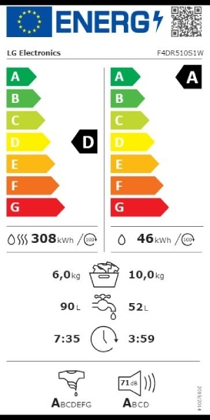 Masina de spalat rufe cu incarcare frontala LG F4DR510S1W si cu uscator are o clasa de eficienta energetica inalta A si consum redus de resurse energetice, dupa vechea eticheta energetica. Consumurile de resurse energetice raman la fel, sa schimbat numai clasa de etichetare energetica si modul de calcul. Consumul de energie bumbac ECO 60°C la sarcina maxima la modul de spalare este de 0,750 kWh/ciclu. Consumul de energie bumbac ECO 60°C cu incarcare partiala la modul de spalare este de 0,498 kWh/ciclu. Iar consumul de energie bumbac ECO 60°C cu incarcare la sfert din sarcina maxima la modul de spalare este de 0,250 kWh/ciclu. Consumul de energie bumbac ECO 40°C la sarcina maxima la modul de spalare este de 0,46 kWh/ciclu. Consumul de energie la programul de spalare/uscare bumbac ECO 60°C cu nivelul de uscare bun de pus in dulap, la sarcina maxima de 6 Kg este de 3,821 kWh/ciclu. Consumul de energie la programul de spalare/uscare bumbac ECO 60°C cu nivelul de uscare bun de pus in dulap, la sarcina partiala de 3 Kg este de 1,962 kWh/ciclu. Consumul de energie la programul de spalare/uscare bumbac ECO 40°C cu nivelul de uscare bun de pus in dulap, la sarcina maxima de 6 Kg este de 3,08 kWh/ciclu. Aceste date tehnice ne indica si modul in care putem sa folosim masina de spalat cu uscator, cat mai aproape de sarcina maxima, unde randamentul si consumul de resurse energetice per kilogram din sarcina admisa este maxima.