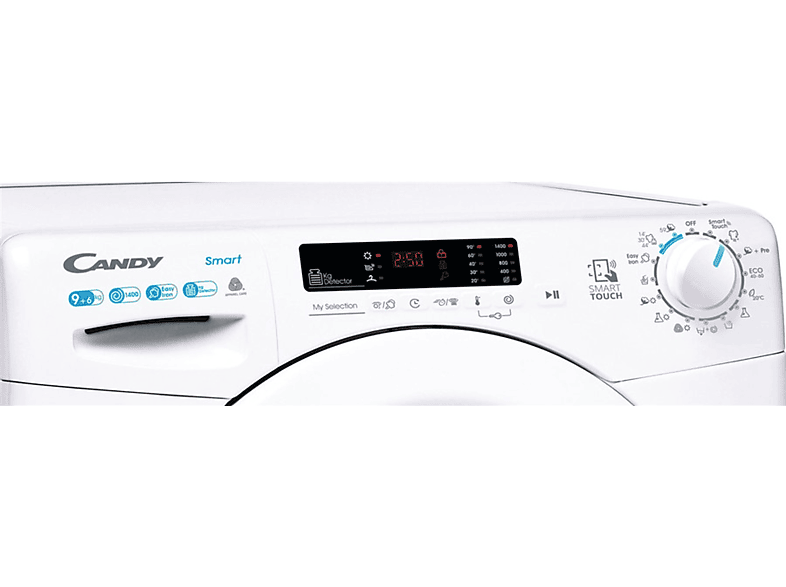 Panoul de comanda mecanic si digital situat in partea superioara este prevazut cu un Smart Ring inel inteligent care se roteste foarte usor si avand un ecran LCD la mijlocul discului cu control electronic, avand functii de spalare si de uscare care se vizualzeaza pe ecranul albastru. Discul rotativ cu care puteti accesa unul din cele 16 de baza + 40 de programe smart: de accesare a functiei Mix Power Jet+ de 59 min si a functiei Usor de calcat este usor de accesat, intuitiv si cuprinde majoritatea optiunilor disponibile pe o masina de spalat si de uscat de obicei mult mai scumpa. Pe ecranul LCD cu text mare si cu pictograme usor de inteles, fac programarea foarte simpla a procesului de spalare si de uscare cu statisticile energetice, datorita afisajului integrat. De asemenea asistentul vocal vă va ajuta la alegerea si configurarea unui program. Fiecare program de spalare are o temperatura si o viteza de centrifugare prestabilita. Daca doriti sa schimbati aceasta temperatura sau viteza de centrifugare, apasati butonul senzitiv de pe display aferent setari temperaturi, sau a vitezei de centrifugare. Functia cu Nivelul de murdarie va permite sa selectati unul dintre cele 3 nivele de spalare, prin modificarea duratei de spalare. Cu butonul de temperatura avem posibilitatea de a seta temperatura de spalare pe 5 trepte de temperatura de la minim 20 la maxim 90°C. Cu butonul de spalare Rapida putem sa setam timpul de spalare de 14; 30; 44; 59 si nivelul de murdarie. Prin activarea functiei de Anti-sifonare ciclul de centrifugare al acestei masini este impartit in mai multe etape, iar miscarile lente ale cuvei impiedica sifonarea lenjeriei. Functia previne formarea cutelor la rufe, facilitand calcarea lor si intr-un timp mai scurt. Activand functia Hygienne+ la un ciclu de spalare programul se deruleaza la temperatura de cel putin 60°C. Aceasta optiune va permite sa igienizati lenjeria pastrand temperatura selectata pe toata durata de desfasurare a programului. Iar datorita procesorului performant din dotare puteti salva pana la 8 dintre cele mai frecvente functii de spalare utilizate si puteti ajusta timpii de programare personalizati. La acest model avem posibilitatea de a opri si apoi de a porni in timpul derulari unui program de spalare. Aceasta functie poate fi folosita si pentru a scoate sau a adauga rufe in masina. Pentru a realiza acest lucru comutam masina in modul Pauza in timpul unui program de spalare, apasand butonul “Pornire/Pauza” iar pe display un indicator ne va indica etapa in care a ajuns ciclul de spalare. Oprirea masinii pe durata unui ciclu de spalare va anula in schimb programul de spalare aflat in derulare. Oprind masina putem face si eventuale modificari ale functiilor auxiliare, ale temperaturii si a vitezei de centrifugare, daca este necesar. Pentru a reporni programul de spalare apasam in continuare pe acelasi buton “Pornire/Pauza”. Modificarile in programul de spalare vor fi facute cu conditia sa fie adecvate programului respectiv iar programul de spalare in derulare nu a fost inca finalizat. In plus acest model afiseaza pe display si coduri de eroare, ce vor atentiona utilizatorul la problemele care pot sa apara in functionare. Cu tasta de selectie nivel de uscare aveti posibilitatea de a selecta durata in functie de nivelul de uscare de: 30 de minute; de 60 de minute si de 90 de minute. La efectuarea automata a unui ciclu automat de spalare/uscare in functie de tipul de rufe, aveti posibilitatea de a alege nivelul de uscare pe 3 trepte. Astfel la finalizarea unui program de spalare, masina va incepe automat sa usuce rufele. Iar daca ati selectat un program de uscare care nu este conform cu natura rufelor acest program nu se va activa. Dupa finalizarea unui program de uscare va porni automat si o faza de racire de aproximativ 10/20 de minute, inainte de a se deschide usa. Programul Child Lock permite blocarea butoanelor masinii pentru a preveni oprirea accidentala sau schimbarea programului. Copiii se pot juca langa masina de spalat/uscat, fara ca sa fie supravegheati permanent. In plus un dispozitiv special de siguranta previne deschiderea usii imediat dupa finalizarea unui program de spalare. In acest sens la 2 minute dupa finalizarea programului, semnalizarea de blocare usa se va stinge. Aceasta masina permite monitorizarea informatiei referitoare la greutatea rufelor din cuva si in primele minute, senzorul de greutate va efectua cantarirea sarcini din masina numai la programele de Bumbac si Sintetice. Procesorul dupa ce primeste informatia privind greutatea rufelor de la senzor regleaza: Cantitatea de apa; Stabileste durata programului; Controleaza ciclurile de clatire in functie de testura articolelor de imbracaminte; Regleaza ritmul de rotatie al cuvei in functie de testura; Recunoaste prezenta spumei si daca este nevoie adauga un ciclu de clatire suplimentar, si regleaza viteza de centrifugare in functie de greutatea rufelor. In plus daca apare o intrerupere a alimentari cu energie electrica datorita unei pene de curent, procesorul va memora setarile facute si la revenirea curentului, programul memorat va reporni de unde s-a oprit. In stanga panoului de comanda Candy are un sertar special conceput pentru alimentare cu detergent solid lichid si balsam. Interiorul compartimentului pentru detergent a fost studiat pentru a evita pierderile si pentru a permite dozarea exacta atat a detergentilor lichizi, cat si a celor sub forma de pulbere. Scara gradata permite, astfel, reglarea cantitatii corecte si evitarea supradozarii. Cuva masini este facuta dintr-un material termorezistent silitech de culoare alb iar tamburul este din otel inox cu o capacitate de 44 de litri, avand diametrul hubloului de 34 cm. Deschiderea hubloului se realizeaza la 180 de grade, astfel si cele mai voluminoase articole pot fi incarcate cu usurinta. Tehnologia Fuzzy Logic detecteaza automat dimensiunea fiecarei incarcaturi in primele 4 minute, calculand necesarul de apa, consumul 
