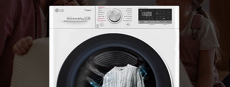 Dupa ce sa terminat programul de spalare propriuzis, tot ce ai de facut este sa pornesti programele pentru uscarea rufelor si in doi pasi simpli ai rufele gata pentru a fi imbracate. Acest model cu capacitatea de spalare de 8 Kg are o capacitate de uscare de maxim 5 Kg de rufe suficient pentru a acoperi necesitatile unei famili numeroase. Cu toate ca, capacitatea de uscare este mai mica cu 3 Kg nu este o problema acest lucru, deoarece o parte din rufe sunt gata pentru a fi calcate, fara sa mai fie nevoie si de uscator, datorita vitezei mari de centrifugare. Procesul de uscare a hainelor porneste automat daca este apasat butonul special, inaintea inceperii spalarii si se selecteaza una din optiunile : timp (de la 30 pana la 120 minute) si nivel de uscare (uscat complet, mediu si usor umed pentru hainele ce necesita calcare). Se poate folosi doar programul de uscare pe 4 nivele fara a mai trece si prin ciclul de spalare apasand tasta speciala. Uscare cu senzori permit masinii de spalat cu uscator sa masoare umiditatea reziduala din haine si sa se opreasca automat la atingerea nivelul corespunzator. Calcare este nivelul cel mai delicat, cu cea mai mare umiditate reziduala, si este ideal pentru articole de imbracaminte care necesita calcare. Programul normal de uscare este folosit pentru tesaturi din bumbac sau panza, precum prosoape de bumbac, tricouri si rufe din panza.