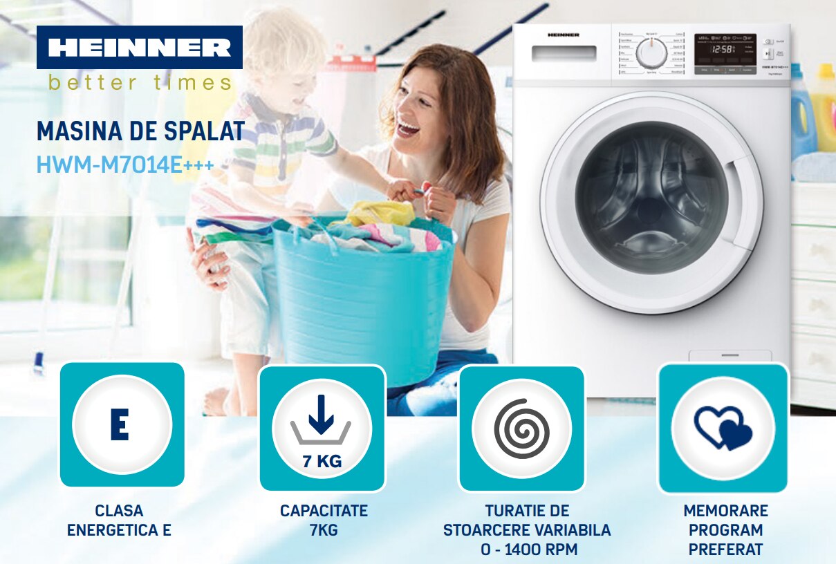 Daca esti in cautarea unei masini de spalat performante care sa nu te dezamageasca si sa o poti folosi la capacitate maxima chiar si dupa 10 ani atunci iti recomand Heinner HWM-M7014E+++. Design-ul este unul modern de culoare alb lotus, placut la vedere ce nu lasa loc de compromisuri potrivindu-se perfect intr-un spatiu destul de redus de numai (H, L, A) cm 85 x 59,5 x 49,5 si o greutate de 61 Kg. Heinner HWM-M7014E+++ este dotata cu un motor universal. Acest tip de motor avand un sistem de suspensi, asigura o functionare ultra-silentioasa de 59 dB la spalare si 80 dB la centrifugare, ridicandu-se la cele mai ridicate standarde de eficienta energetica.