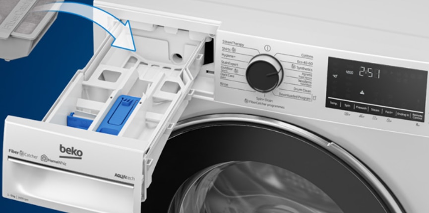 In stanga panoului de comanda se afla sertarul cu 3 compartimente pentru ciclul de pre-spalare, sau agent de indepartare a petelor, compartiment pentru faza de spalare si un compartiment pentru balsam de rufe si alte tratamente cu lichid de (intretinere rufe, apret). Sertarul are in dotare si o clapeta pentru detergent pudra sau lichid. La adaugarea detergentului lichid sau a balsamului, nu trebuie sa depasiti nivelul MAX. Pentru un plus de confort sertarul pentru detergent este dotat si cu tehnologia Auto Clean Detergent Drawer ce se curata automat dupa fiecare ciclu de spalare, doar prin directionarea apei in sertar. Astfel, prin folosirea acestei tehnologi se evita formarea mucegaiului sau a mirosurilor neplacute cauzate de umiditatea din sertar si se elimina si urmele de detergent. In plus apa murdara care este evacuala la sistemul de canalizare are in dotare si un sistem de filtrare Fiber Catcher a micro fibrelor sintetice din textilele spalate, ce capteaza o mare parte dintre acestea, impiedicandu-le sa ajunga in apa. Aceasta tehnologie noua contribuie ca apa marilor si a oceanelor sa fie mai curata.