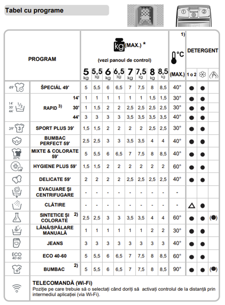 Programul Daily Hygiene, masina asigura o spalare rapida cu eficienta energetica buna si cu rezultate perfecte de spalare in doar 59 minute la 60°C ce se deruleaza la o cantitate de maxim 2 Kg. Acest program este adecvat pentru articole de imbracaminte cu nivel mare de murdarie din bumbac. Programul de spalare Sport Plus este creat special pentru a curata echipamentul sportiv. Acest program ce se deruleaza timp de 29 de minute, foloseste apa cu temperatura redusa la 30°C, la o cantitate de maxim 2,5 Kg de articole de imbracaminte cu nivel redus de murdarie. Un program Bumbac ECO ce foloseste o cantitatea redusa de apa si energie cu temperatura de spalare de 40°C si de 60°C incepand de la o sarcina de 2 de 4 sau de 8 Kg de rufe, in functie de nivelul de murdarie. Acest program de spalare este in schimb mai lung fata de un program normal. In momentul cand incarcati masina cu o cantitate de rufe mai mica (de ex. jumatate din capacitatea maxima sau mai putin), programul de spalare se scurteaza. In acest caz, consumul de energie si apa va scadea mai mult, asigurand o spalare mai economica. Acest program ECO este testat conform EN 60456 cu clasificare energetica dupa Directiva 1061/2010. Programul de spalare ECO este potrivit pentru spalarea tesaturilor de bumbac cu grad normal de murdarie, el fiind cel mai eficient program in termeni de consum de resurse energetice, apa si curent. Cu aceasta combinatie, temperatura reala poate varia fata de programele specificate. Timpii de spalare vor creste in beneficiul unui consum mai redus de energie, iar eficienta la spalare in clasa A este permanent garantata. Durata programului (bumbac ECO 40-60ºC la sarcina maxima) este de 3 ore si 38 de minute. Durata programului (bumbac ECO 40-60ºC cu incarcatura partiala) este de 2 ore si 48 de minute. Iar durata programului (bumbac ECO 40-60ºC cu incarcare la sfert din sarcina maxima) este la fel de 2 ore si 48 de minute. Programul de Bumbac 60°C cu prespalare pentru articole de imbracaminte extrem de murdare, ce se deruleaza la capacitate maxima. Prespalarea este necesară numai pentru haine foarte murdare. Renunţand la prespalare economisiţi energie, apa, detergent şi timp. Programul de Bumbac 90°C pentru albituri, se deruleaza la capacitate maxima. La pornirea programelor de Bumbac si Bumbac ECO, afisajul indica la inceput durata programului de spalare pentru o incarcare pe jumatate. Astfel in primele minute dupa pornirea programului senzorul de greutate impreuna cu procesorul, detecteaza cantitatea reala de rufe. Daca procesorul detecteaza o cantitate mai mare decat jumatate din cantitatea de rufe, programul de spalare se regleaza, iar durata programului va creste automat. Aceasta schimbare poate fi urmarita si de pe afisaj. Spalare manuala 30°C acest program este dedicat pentru a spala hainele de lana/delicate care au etichete cu „a nu se spăla în maşina”, pentru care se recomanda spalarea manuala, la o cantitate de maxim 2 Kg. Astfel masina de spalat rufe este certificata Woolmarkt ce este certificarea maxima emisa de The Woolmark Company pentru marcile care ating standarde atat de ridicate de calitate incat masinile lor de spalat pot spala si hainele care au eticheta numai spalare manuala. In Marea Britanie, Irlanda, Hong Kong si India, marca comercială Woolmark este o marca comerciala certificata. Programul de spalare Sintetice si colorate la 20°C, in functie de nivelul de murdarie, program ce spala la o cantitate de 4 Kg de rufe. Iar cu programul de spalare Dark/Jeans putem spala perfect si omogen chiar si tesaturile groase. Acest program se deruleaza la o cantitate de maxim 3 Kg. Programul Anti-sifonare se activeaza numai atunci cand a fost setata temperatura de spalare la 60°C. Aceasta optiune permite si igienizarea articolelor de imbracaminte, mentinand aceeasi temperatura pe tot parcursul programului de spalare. Program extra-clatire se adaugă un ciclu de clătire în plus faţă de cel de după ciclul principal de spălare. Este diminuat astfel riscul afecţiunilor caracteristice unei piei sensibile (în cazul bebeluşilor sau a alergiilor etc) datorate unor eventuale resturi de detergent. Programele spaciale ale acestui model sunt: Programul de Clatire suplimentara la capacitate maxima; Programul de Stoarcere si Evacuare de 10 de minute la capacitate maxima si programul de doar Evacuare, de 3 de minute la capacitate maxima. Pentru a curata tamburul periodic trebuie sa rulati un program de bumbac fara rufe la temperatura maxima la care se adauga o cantitate mica de detergent pudra. Periodic acest model de masina ne va avertiza de acest lucru care este absolut necesar.