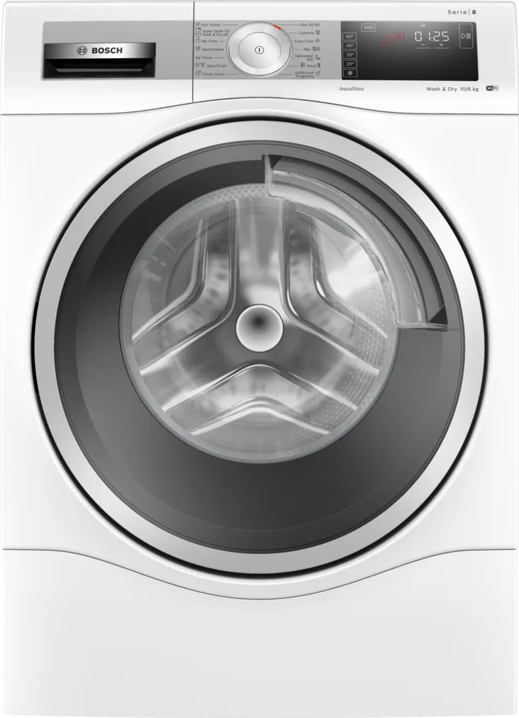 Poti alege intre cele 15 programe predefinite pentru o spalare cat mai eficienta: mixt, delicate, sintetice, bumbac, lana, spalare manuala. Programele speciale ale masini de spalat rufe cu uscator Bosch 4WDU8H542EU sunt urmatoare: Program automat de spalare si uscare Bumbac într-un singur ciclu, unde putem sa selectam temperatura de spalare de la rece la maxim 90°C. Acest program se deruleaza la capacitate maxima de 10 Kg la modul spalare si de 6 Kg la modul de uscare. Un program Bumbac ECO ce foloseste o cantitatea redusa de apa si energie cu temperatura de spalare de 40°C si de 60°C incepand de la o sarcina de 2,5 de 5 sau de 10 Kg de rufe, in functie de nivelul de murdarie. Acest program de spalare este in schimb mai lung fata de un program normal. In momentul cand incarcati masina cu o cantitate de rufe mai mica (de ex. jumatate din capacitatea maxima sau mai putin), programul de spalare se scurteaza. In acest caz, consumul de energie si apa va scadea mai mult, asigurand o spalare mai economica. Acest program ECO este testat conform EN 60456 cu clasificare energetica dupa Directiva 1061/2010. Programul de spalare ECO este potrivit pentru spalarea tesaturilor de bumbac cu grad normal de murdarie, el fiind cel mai eficient program in termeni de consum de resurse energetice, apa si curent. Cu aceasta combinatie, temperatura reala poate varia fata de programele specificate. Timpii de spalare vor creste in beneficiul unui consum mai redus de energie, iar eficienta la spalare in clasa A este permanent garantata. Durata programului (bumbac ECO 40-60ºC la sarcina maxima) este de 3 ore si 55 de minute. Durata programului (bumbac ECO 40-60ºC cu incarcatura partiala) este de 2 ore si 55 de minute. Iar durata programului (bumbac ECO 40-60ºC cu incarcare la sfert din sarcina maxima) este de 2 ore si 20 de minute. La pornirea programelor de Bumbac si Bumbac ECO, afisajul indica la inceput durata programului de spalare pentru o incarcare pe jumatate. Astfel in primele minute dupa pornirea programului senzorul de greutate impreuna cu procesorul, detecteaza cantitatea reala de rufe. Daca procesorul detecteaza o cantitate mai mare decat jumatate din cantitatea de rufe, programul de spalare se regleaza, iar durata programului va creste automat. Program Easy Care de amestec de tesaturi din bumbac si sintetice la capacitatea maxima de spalare de 4 Kg si de uscare de maxim 2,5 Kg. Programul Mixt ce permite spalarea si uscarea materialelor sintetice si a celor din bumbac in acelasi ciclu al masinii de spalat. Acest program se deruleaza la capacitatea de maxim 4 Kg la modul de spalare si de 2,5 Kg la modul de uscare. Program de spalare articole Delicate pentru spalarea rufelor delicate cum ar fi imbracamintea tricotata din bumbac/amestec de bumbac sau ciorapi. Acest program spala cu o miscare mai delicata. Cu acest program spalati hainele a caror culoare vreti sa se pastreze fie la 20°C, fie selectand optiunea de spalare cu apa rece. Acest program se deruleaza numai la modul de spalare de maxim 2 Kg. Programul Lana permite spalarea si uscarea articolelor din lana la temperatura de 30°C sau de 40°C, fara a le deteriora. Acum poti spala hainele din lana in siguranta si fara efort. Acest program se deruleaza la modul de spalare la maxim 2 Kg si de maxim 1 Kg la modul de uscare. Daca sunteti o persoana care face mult sport masina are in dotare programe speciale de Sport concepute pentru spalarea si uscarea echipamentului si incaltamintei de sport, care contin amestec de bumbac/sintetice si straturi impermeabile. Acest program utilizeaza o temperatura de spalare de 40°C cu un grad scazut de murdarie, la o cantitate de 2 Kg si la fel de maxim 2 Kg la modul de uscare. Functia reminder Eco Drum Clean este un ciclul de curatare ecologica a tamburului la 90°C sau la 40°C, ce va inlatura resturile de detergent si acumularile de murdarie, fara substante chimice dure. O alarma se declanseaza dupa 40 de spalari pentru a ne atrage atentia. Programul de improspatare cu aport de abur Iron Assist ce are rolul de a reduce nivelul de sifonare si mirosurile neplacute, la articole de imbracaminte curate din bumbac in si amestecuri. Acest program se deruleaza la capacitatea de maxim 5 camasi sau 5 tricouri. Daca activati si optiunea Speed Perfect la acest program capacitatea programului se reduce la un singur tricou sau o singura camase. Acest program nu poate fi folosit datorita temperaturi ridicate a aburului la articole de imbracaminte de exterior, matase sau lana. Programul My Time cu durata de 120 de minute pentru uscare, permite uscarea materialelor sintetice si a celor din bumbac. Programul se deruleaza la uscare la o cantitate de maxim 6 Kg de rufe. Programul de spalare Super Quick Wash & Dry cu durata de 15 minute pentru spalare si de 60 de minute pentru uscare este folosit pentru rufe cu nivel mic de murdarie. Acest program de spalare si de uscare se deruleaza la capacitatea de maxim 2 Kg la modul de spalare si de 1 Kg la modul de uscare. In plus puteti sa descarcati si programele de spalare si de uscare suplimentare pe care le puteti folosi cu ajutorul optiuni Additional Programs. Aceste programe le puteti descarca numai cu ajutorul aplicatiei Home Connect. Programul de spalare si de uscare Wash & Dry este folosit pentru a spala rufele din bumbac pana la 6 kg si a le usca dupa ciclul de spalare fara a accesa o alta selectie. Durata programului este de 8 ore. Iar la capacitatea de maxim 3 Kg durata programului este de 4 ore. Acest program sa luat ca referinta pentru eticheta energetica. Cu programul Spin/Drain centrifugati si evacuati apa Cu acest program Bosch iti ofera posibilitatea de a-ti configura spalarea asa cum vrei. Cu functia de Rinse se mai efectueze o clatire suplimentara fata de clatirea care a fost deja efectuata dupa spalarea principala, urmat de evacuarea apei. Cu aceasta functie, nemai existand riscul ca pielea sensibila de ex. (bebelusi, piele alergica etc.) sa fie afectata de urmele de de